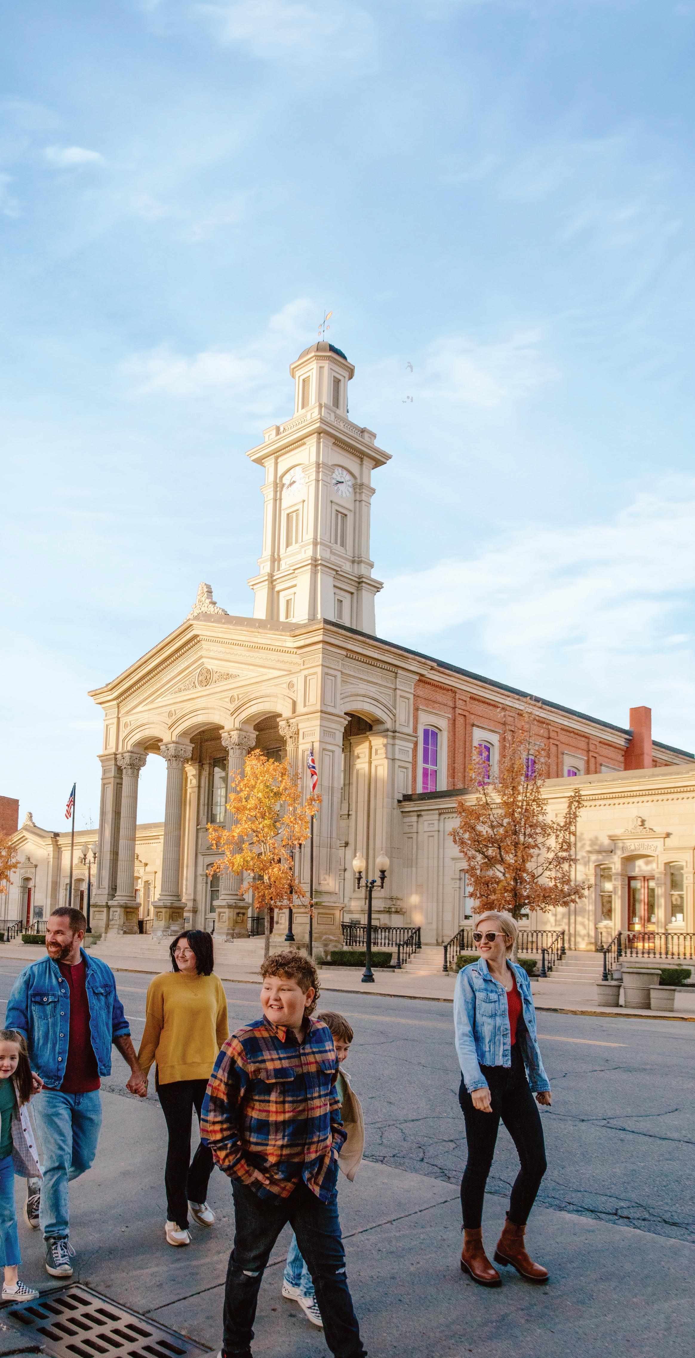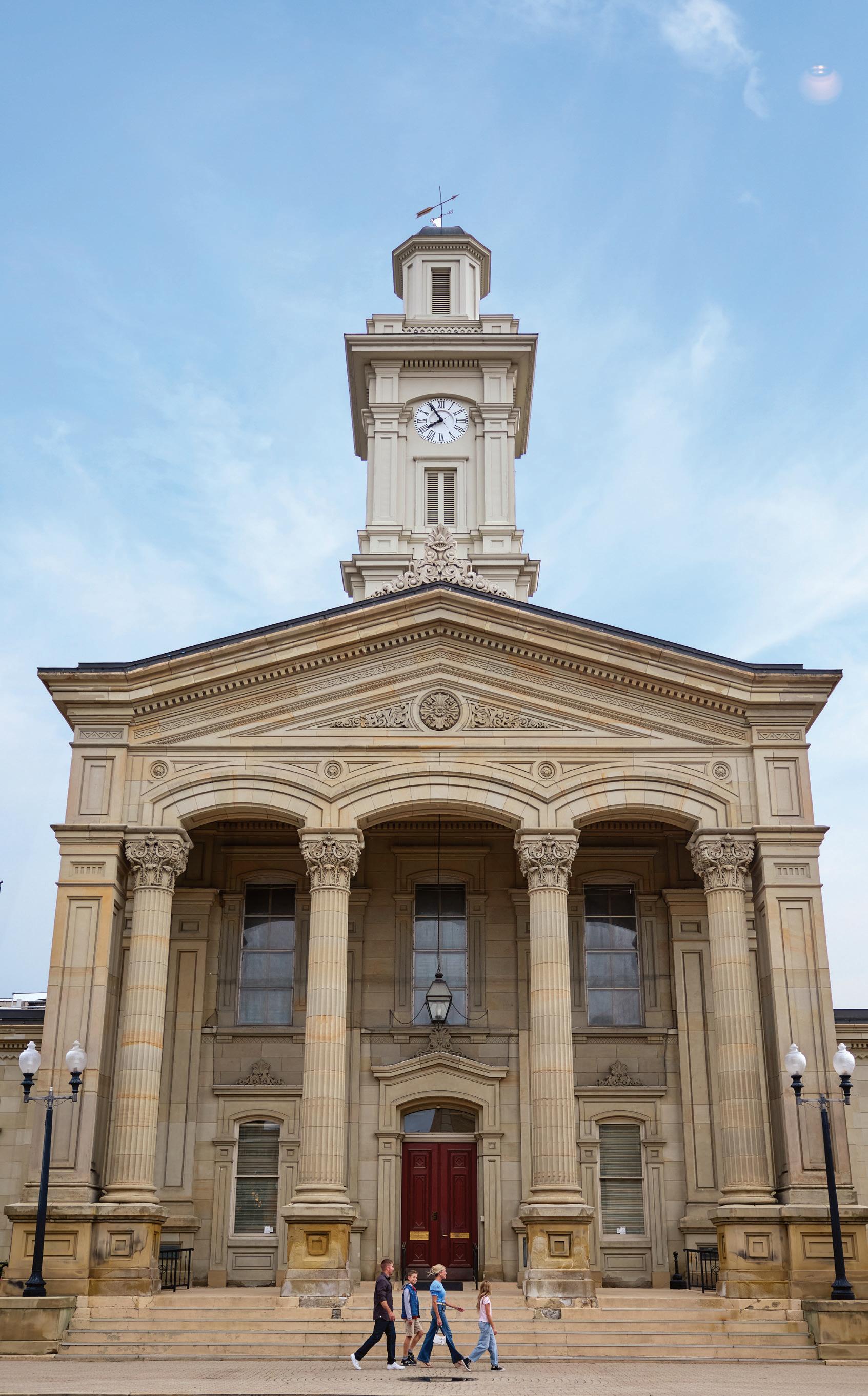 Walk Paint Street and step into layers of history, from church spires to wartime stories. The Wissler Building once hosted Officers Club No. 1 during Chillicothe’s Camp Sherman days in WWI, when thousands of soldiers filled the city. The 1875 Italianate-style City Hall kept watch over downtown — its back wall doubling as the city jail until 1989. Nearby, St. Mary’s Catholic Church (1869) once ran a busy school just around the corner on Fourth Street, though the building no longer exists. The Franklin House (1907), a Prairie Style gem, now houses a women’s museum, while the Chillicothe Ross County Public Library (1906) still welcomes readers with its grand façade. Memories of Camp Sherman linger on this street; the 20thcentury Sherman Theater and Winter Garden offered soldiers live entertainment and showed movies on the old canal bed. Walk around the corner to the Elks Club at 42 W. Second Street and the Majestic Theatre (1853, Masonic Hall). Both played somber roles during the 1918 Spanish flu outbreak, which claimed over 1,100 lives; the latter location served as an embalming site for the camp’s flu victims. The Ross County Courthouse served as a bustling info hub and the site where 20,000 troops celebrated the war’s end, and the old 1906 Chillicothe Post Office saw local draftees board buses to training. Here, history is built into every brick.