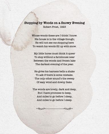 Frost, Robert. “Stopping by Woods on a Snowy Evening.” 1923. Poetry Foundation, www.poetryfoundation.org/poems/42891/ stopping-by-woods-on-a-snowy-evening.