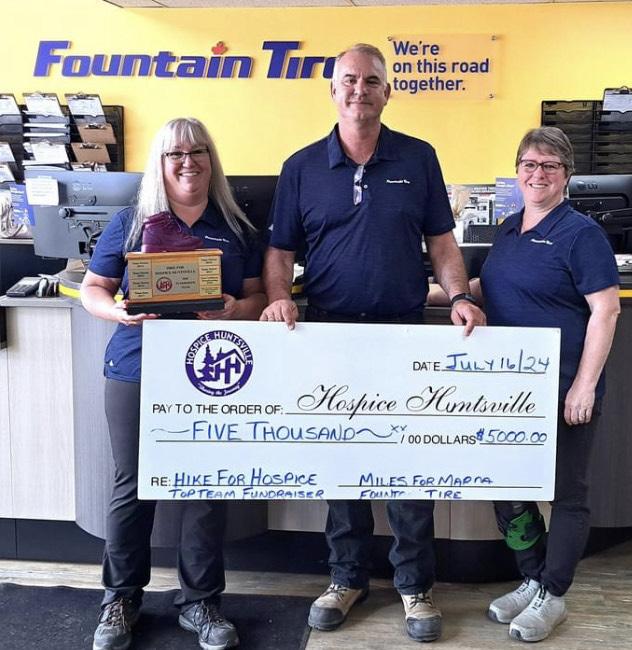 Introducing the ‘Top Hike for Hospice Team’ A special to our friends from Miles for Marda Team/Fountain Tire Huntsville for raising an amazing $5,000 for Hospice Huntsville in the 2024 Hike for Hospice! We appreciate all the support of Fountain Tire/Huntsville, the team members, and their generous donors that contributed to the Hike. Congratulations to the Miles for Marda team! Left to right: From Fountain Tire: Kim, Steve, Jackie