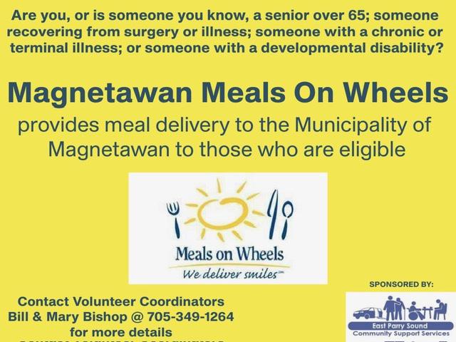FROZEN MEAL DELIVERY! MEALS ARE $7.00 & CONSIST OF MAIN COURSE & DESSERT "DELIVERED EVERY TUESDAY - ELIGIBLE PERSONS INCLUDE: - SENIORS 65+ -THOSE WHO ARE TERMINALLY/CHRONICALLY ILL - THOSE WITH A DEVELOPMENT DISABILITY - THOSE RECENTLY DISCHARGED FROM HOSPITAL (I.E. POST SURGERY) - EAST PARRY SOUND Support Services - FOR MORE INFO & TO ORDER - CONTACT CSS @ 705724-6028