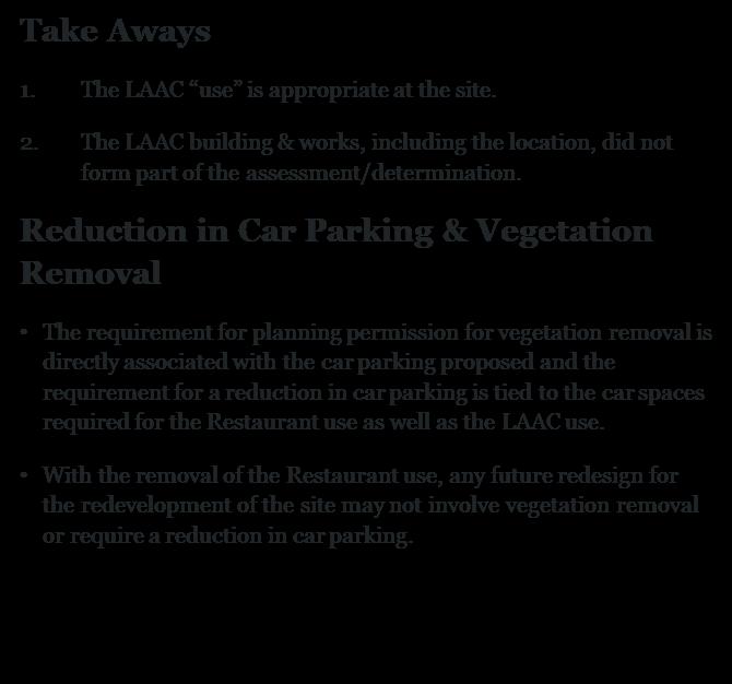 1. The reduced scale of any food & drinks “use”, as well as a reduced building footprint for any associated structure, will reduce the required number of car parks, and should therefore avoid any vegetation removal.