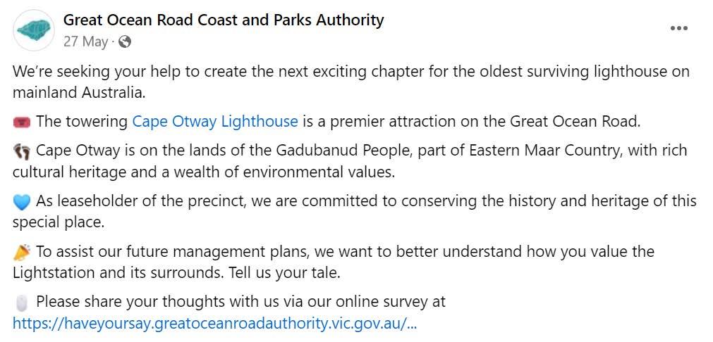 Thank you for engaging with us on how you value the Cape Otway Lightstation Precinct. Providing your feedback helps us to better understand the key issues concerning the local community and visitors, and ensures we are listening, respecting, and reflecting community views in our management approach. We are committed to meeting the needs of the community and visitors now and for generations to come.
