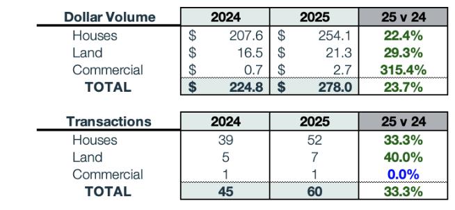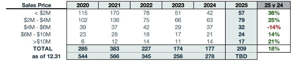 YTD Average sales price currently sits at $4.37M, compared to $4.45M prior, while YTD Median sales price is $3.18M vs $3.4M in 2024. Overall, transaction volume remains healthy while dollar volume continues to perform strongly.