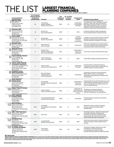 Company/Address/ Phone/Fax/Web RBC Royal Bank 90 Sparks St. Ottawa, ON K1P 5B4 1-800-463-3863 rbcroyalbank.com Richardson GMP 300-343 Preston St. Ottawa, ON K1S 1N4 613-230-7735 richardsongmp.com Gentry Capital 508-1900 City Park Dr. Gloucester, ON K1J 1A3 613-746-7200 / 613-746-7282 gentrycapital.ca Raymond James 750-45 O’Connor St. Ottawa, ON K1P 1A4 613-369-4600 Mandeville Private 610-1565 Carling Ave. Ottawa, ON K1Z 8R1 613-728-0101 michaelprittie.ca Crain & Schooley Financial 7-471 Hazeldean Rd. Kanata, ON K2L 4B8 613-722-3444 crainschooley.on.ca John D. Landry Financial and Quadrus Investments G2-160 Terence Matthews Cres. Kanata, ON K2M 0B2 613-271-0555 / 613-271-9551 jdlfinancial.ca Foundation Private Wealth Management 204-460 West Hunt Club Rd. Ottawa, ON K2E 0B8 613-228-8810 foundationpwm.com Future Financial Planning Group 201-370 Churchill Ave. Ottawa, ON K1Z 5C2 613-728-0589 futurefinancial.com Snipper Financial Planning 150 Isabella St. Ottawa, ON K2S 1V7 613-236-8878 snipperfinancialplanning.com Amira Mamhikoff Finanical Planner 154 Challenge Cres. Orleans, ON K4A 0T9 613-742-8585 ambfinancial.ca Bank of Montreal Capital Centre Branch 269 Laurier Ave. W. Ottawa, ON K1P 5J9 613-564-6416 / 613-564-6818 bmo.com CIBC / CIBC Wood Gundy 222 Queen St., 2nd floor Ottawa, ON K1P 5V9 613-564-4162 / 613-563-9600 cibc.com Scotiabank Group 119 Queen St. Ottawa, ON K1P 6L8 613-564-5194 / 613-564-7946 scotiabank.com TD Canada Trust & TD Commercial Banking 240-45 O’Connor St. Ottawa, ON K1P 1A4 613-783-6104 / 613-783-6617 td.com