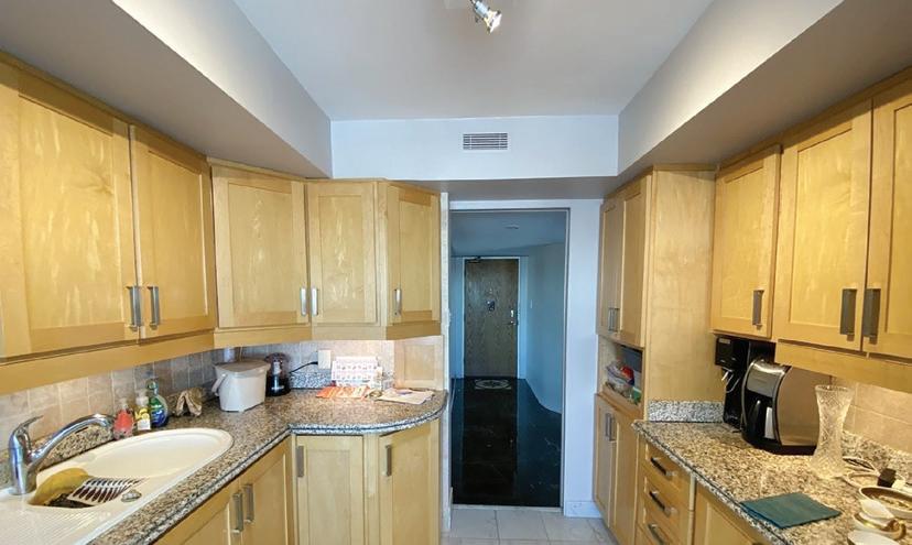 Bottom Left: Glass cabinet doors with narrow black aluminum framing, a waterfall island countertop and a strong linear design help define the kitchen’s esthetic and the condo’s greater openness. All above photos: