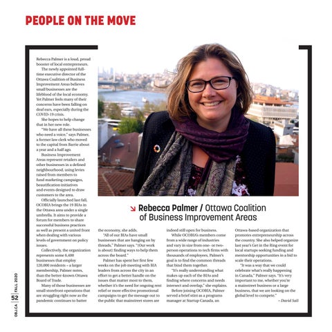 Rebecca Palmer / Ottawa Coalition of Business Improvement Areas the economy, she adds. “All of our BIAs have small businesses that are hanging on by threads,” Palmer says. “(Our work is about) finding ways to help them across the board.” Palmer has spent her first few weeks on the job meeting with BIA leaders from across the city in an effort to get a better handle on the issues that matter most to them, whether it’s the need for ongoing rent relief or more effective promotional campaigns to get the message out to the public that mainstreet stores are