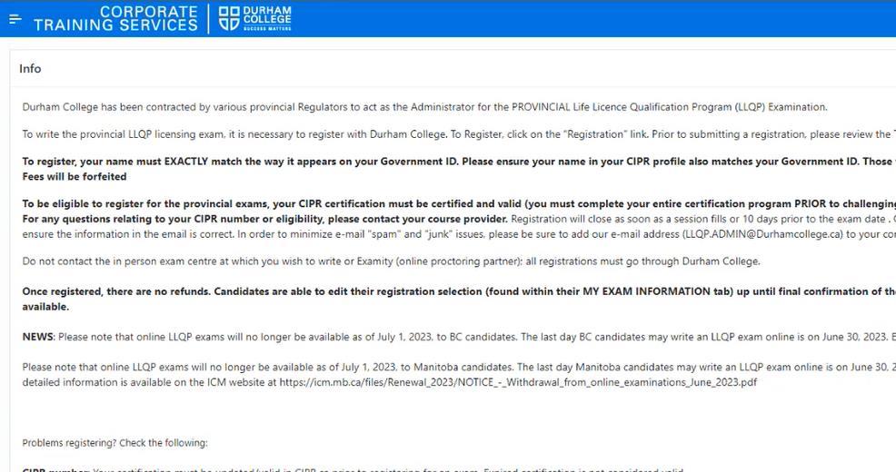 You must register a minimumof ten (10) days prior to the examdate. Registrationwill closeat 7:00am,10 days prior to the exam.Sessionsmay closeto bookingearlierthan 10 days once theyfill. Once your registrationhas beenprocessed,you will receivean e-mailconfirmingthe registration.In order to minimizee-mail"spam" and "junk" issues,pleasebesure to add our e-mailaddress (LLQP.ADMIN@Durhamcollege.ca)to your contact list.