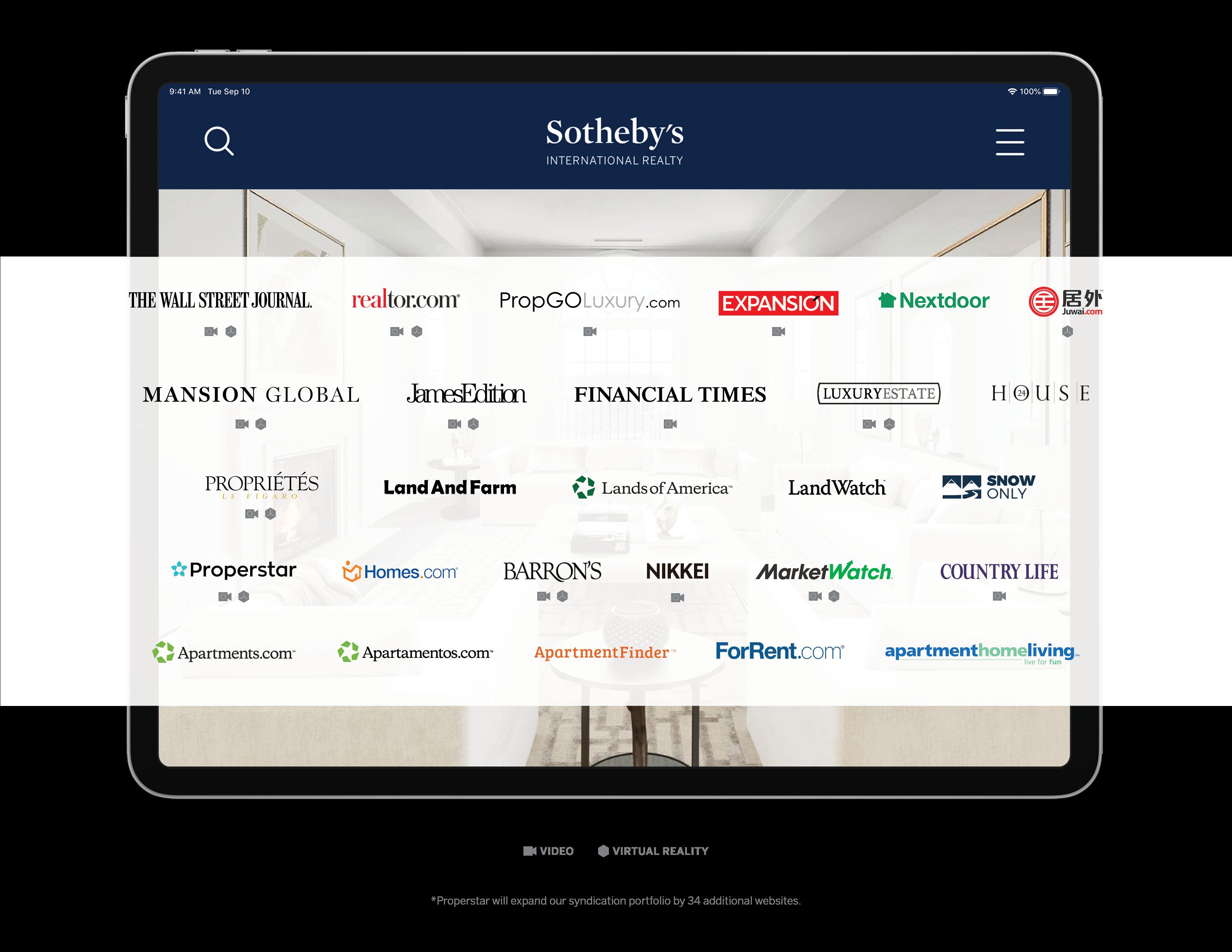 The exposure and worldwide reach of our listings is a crucial piece of what sets us apart from therest of the industry.Our global media partnersinclude themost authoritative news,lifestyle,and financialvoices,as well as real estate-centric websites.Once ahome is showcased on sothebysrealty.com,it issyndicated to more than 30 international websites that are leaders in their categories and markets,and will also be marketed on more than 100 local Sotheby?s International Realty®websites.
