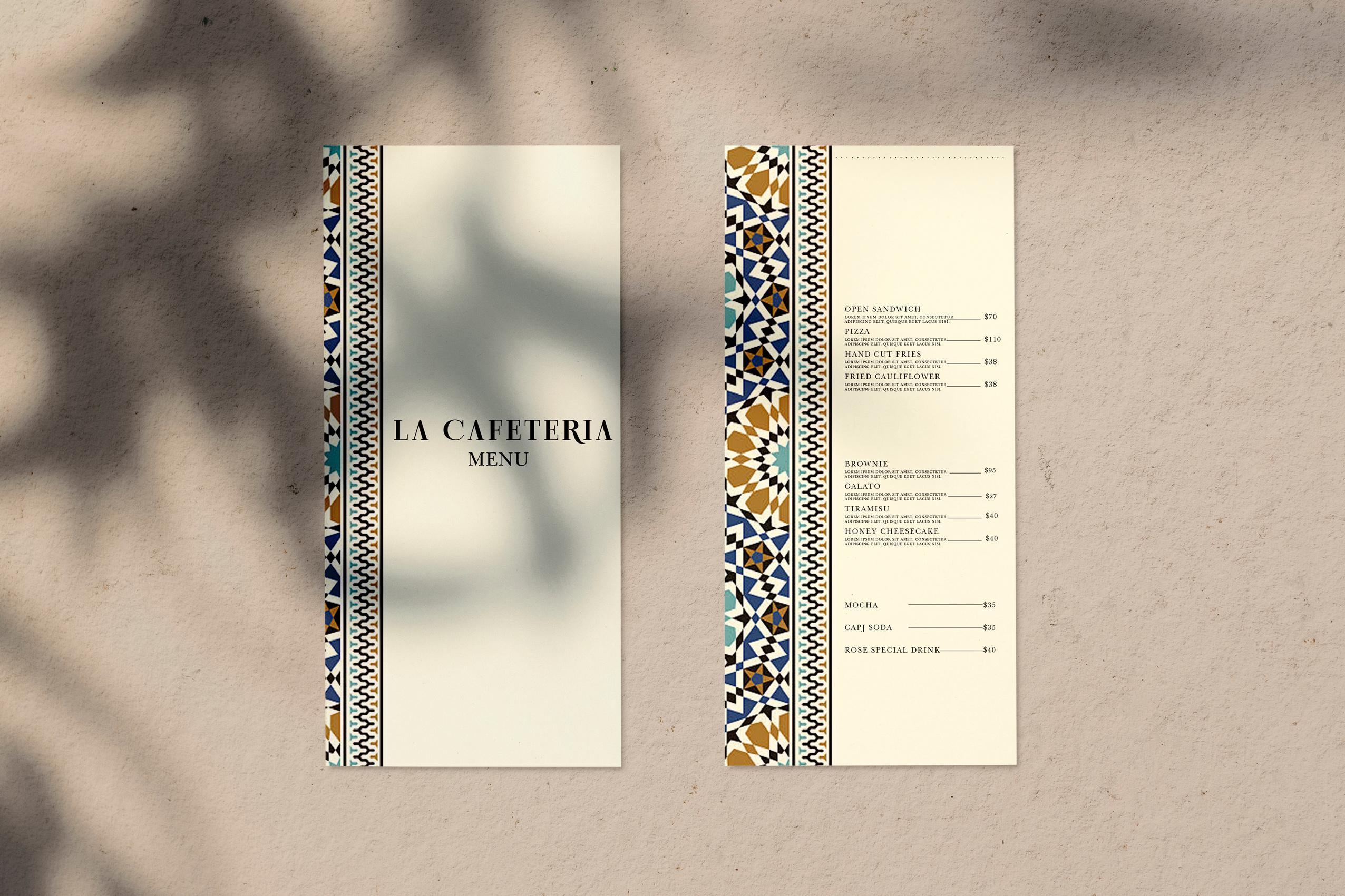The logo and menu are like the facade of a restaurant. A menu with a unique design and beautiful pictures can instantly attract consumers' attention and make them choose your restaurant, but La Cafeteria lacks these designs. La Cafeteria needs a new brand identity (LOGO, menu), the ideal result is that the brand identity of the restaurant can cooperate with the environment of the restaurant, bringing out the feeling of Moroccan style.