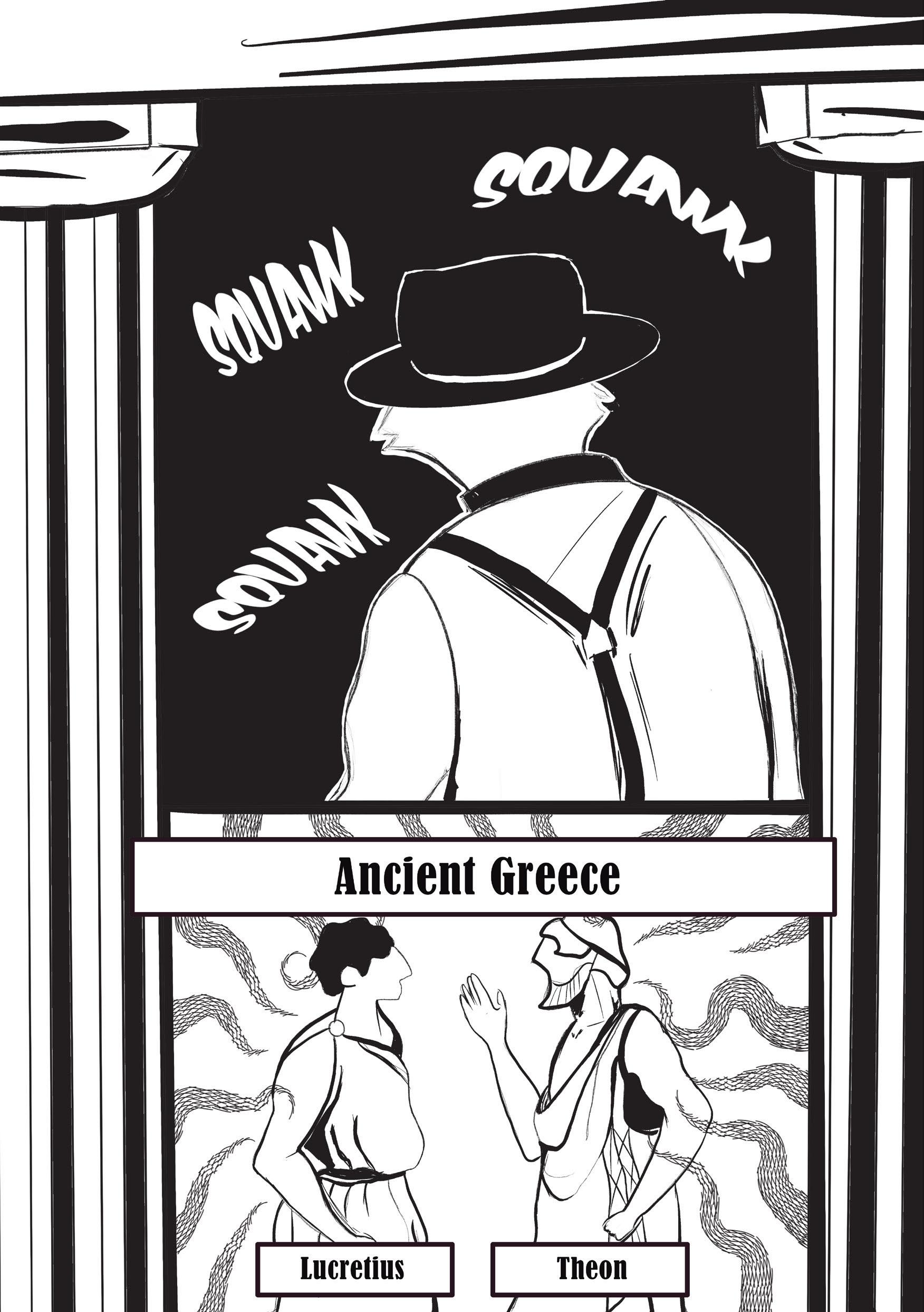 The incident took place at the Agora of Athens near Monastiraki, a large number of people and scholars gathered Lucretius and Theon of Smyrna are debating whether the earth is round or flat. " Agora:Anopen-airmeetingplaceforcitizenstoengageinvarious activitiesinancientGreekcities,usuallylocatedinthecentreof thecityorneartheport,wherepeoplecan debatefreely."
