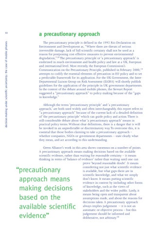 The precautionary principle is defined in the 1992 Rio Declaration on Environment and Development as, “Where there are threats of serious irreversible damage, lack of full scientific certainty shall not be used as a reason for postponing cost-effective measures to prevent environmental degradation,”18 The precautionary principle or ‘a precautionary approach’ is enshrined in much environment and health policy and law at a UK, European and international level. Most recently, the European Commission’s Communication on the Precautionary Principle, published in February 2000,19 attempts to codify the essential elements of precaution in EU policy and to set a predictable framework for its application. For the UK Government, the InterDepartmental Liaison Group on Risk Assessment (ILGRA) will shortly publish guidelines for the application of the principle in UK government departments. In the context of the debate around mobile phones, the Stewart Report suggested a “precautionary approach” to policy-making because of the “gaps in knowledge.” Although the terms ‘precautionary principle’ and ‘a precautionary approach,’ are both used widely and often interchangeably, this report refers to “a precautionary approach” because of the current lack of a detailed definition of ‘the precautionary principle’ which can guide policy and action. There is still considerable debate about what ‘a precautionary approach’ means in practical policy terms. Without clear definitions, there is a danger that is will be invoked in an unpredictable or discriminatory way. To overcome this, it is essential that those bodies claiming to take a precautionary approach – whether companies, NGOs or government departments – state clearly what they mean, and act according to this understanding. Green Alliance’s work in this area shows consensus on a number of points. A precautionary approach means making decisions based on the available scientific evidence, rather than waiting for reasonable certainty – it means thinking in terms of ‘balance of evidence’ rather than waiting until one can prove ‘beyond reasonable doubt’. It means considering not just what scientific evidence is available, but what gaps there are in scientific knowledge, and what we simply don’t know. It means putting scientific evidence in context by including other forms of knowledge, such as the views of stakeholders and the wider public. Lastly, it means being open and transparent about assumptions made, and about the reasons for decisions taken. A precautionary approach always implies judgement – it is not an automatic or objective process – but this judgement should be informed and deliberative, not arbitrary.20