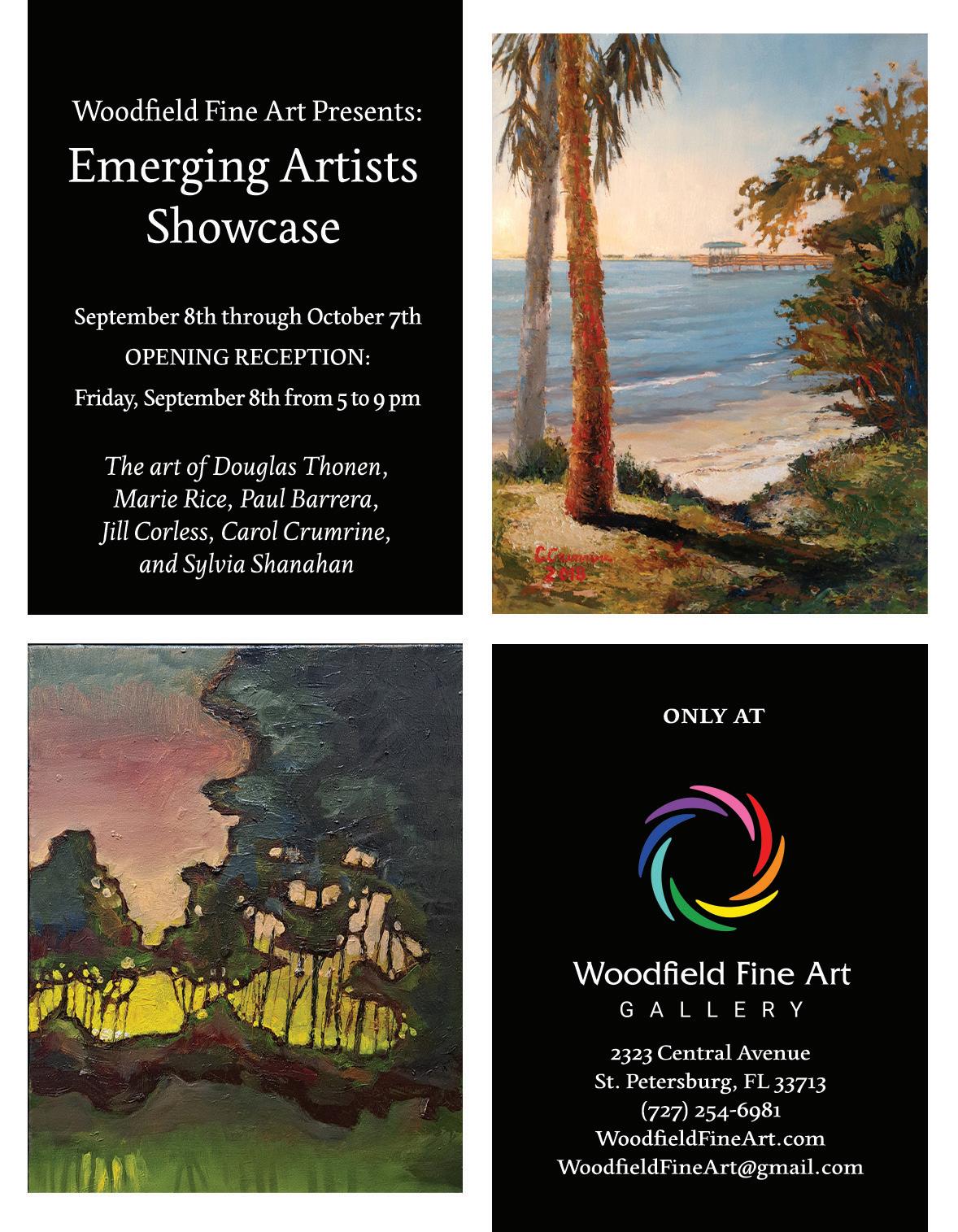 You won’t want to miss the upcoming Emerging Artists Showcase featuring the work of six talented artists carefully selected by Jim Woodfield, owner of Woodfield Fine Art. Their work is displayed in the gallery, and they will create four to six new pieces each for the showcase that will run from Sept. 8 through Oct. 7. Opening night will feature wine, beer and snacks in the company of art admirers from throughout