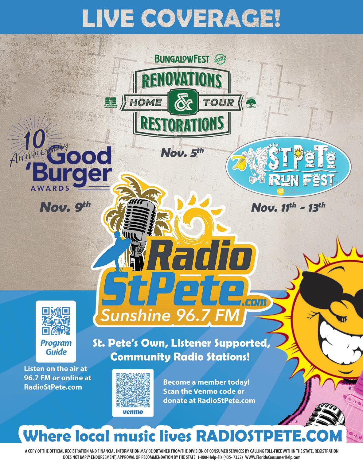 It will be “all hands on deck” to prepare Radius Church’s Thanksgiving meal donations for those in need throughout St. Pete. “Last year we donated 500 meals, and this year we plan to do 750,” Pastor Blake Clark reports. Food donations of stuffing mix, macaroni and cheese, canned corn, green beans, cranberry sauce, and sweet potatoes or yams can be dropped off at numerous locations throughout St. Pete. Destinations include Great Explorations Children’s Museum, Black Crow Coffee Co., (where you will receive a free coffee when you donate), 9 Round Fitness, MarineMax, Machine Shop Barber, Little Greek Fresh Grill and Green Bench Brewing Co. Monetary donations are also greatly appreciated to purchase turkeys and pies and can be mailed