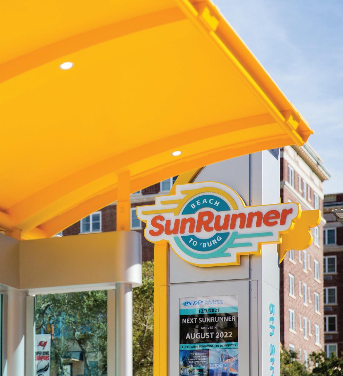 The SunRunner Bus Rapid Transit (BRT) system between Downtown and St. Pete Beach launched last month as the first BRT project in Tampa Bay. The end-to-end ride takes about 35 minutes, twice as fast as the Central Avenue Trolley, from 3rd Street in downtown St. Pete to St. Pete Beach’s Pinellas County Beach Park. The new bus line features dedicated Bus And Turn (BAT) lanes and Transit Signal Priority (TSP) technology. Additionally, the buses include free WiFi on board, charging ports at each seat, and indoor bike racks. The bus is free to ride until April 2023, when fare will increase to $2.25. Hours of operation are from 6 am to midnight with buses arriving every 15 minutes until 8 pm and at 30-minute intervals at night.