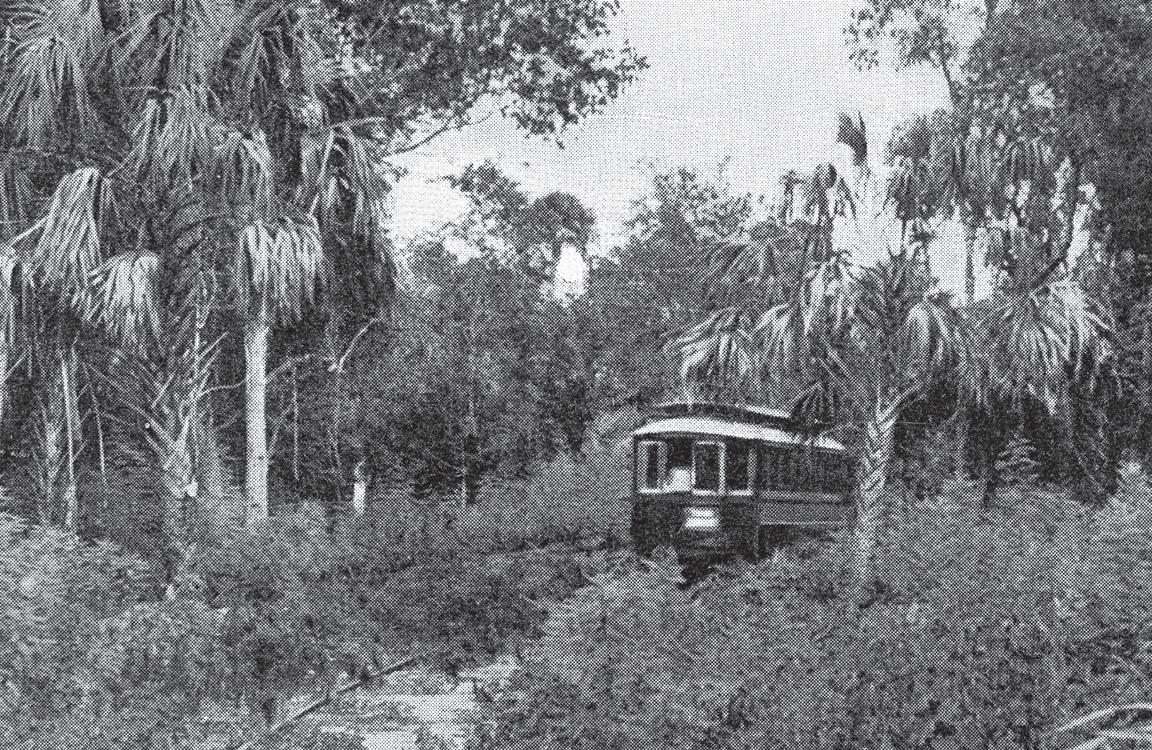 development was definitely the central purpose for the trolley’s financial backers. The system’s popularity among riders went beyond the pragmatic purpose of transporting people to their homes or jobs more quickly. The ride and the trolley car could be attractions in themselves. For example, the line’s first extension was to present-day Gulfport, where riders could enjoy refreshments on the dock and/or board the Pass-A-Grille Ferry. By 1906, leisure seekers could take the trolley onto St. Pete’s new Electric Pier (and a decade later, the Million Dollar Pier). Later track extensions took visitors through the undeveloped areas that promised riders an exciting trip through “jungle-like country side” and the “real tropics.” For developers, the central purpose of these latter extensions to Coffee Pot Bayou, through Goose Pond to Boca Ciega Bay, and through the Jungle area was not to offer a joy ride. These extensions were meant to help transform those undeveloped areas into developed ones. Between 1907 and 1917, the electric trolley lines more than tripled in length, and St. Pete grew along with them.