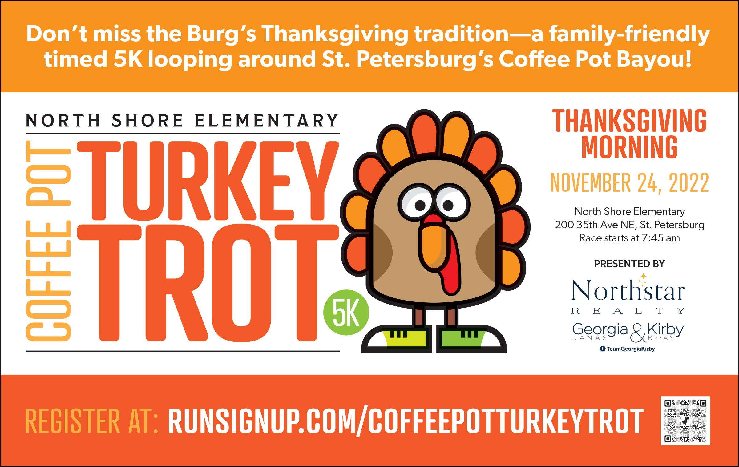 Family-friendly, timed 5K looping around St. Petersburg’s Coffee Pot Bayou on Thanksgiving morning. Hosted by the North Shore Elementary PTA to benefit North Shore Elementary, a Title One School. runsignup.com/ coffeepotturkeytrot