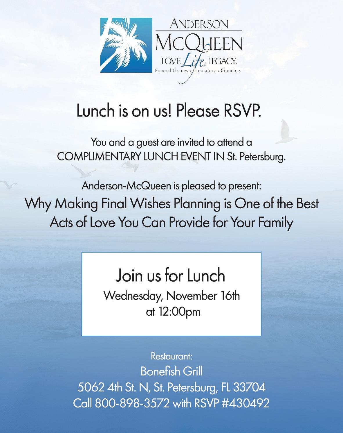directly to the church at 165 13th St. N, St. Petersburg, FL 33705 or made online at RadChurch.com under “Next Steps, Giving.” From 6 to 8 p.m. on Nov. 20, the Sunday night before Thanksgiving, volunteers pack up all the dinners that are delivered the next day. Packers and drivers are more than welcome to attend.