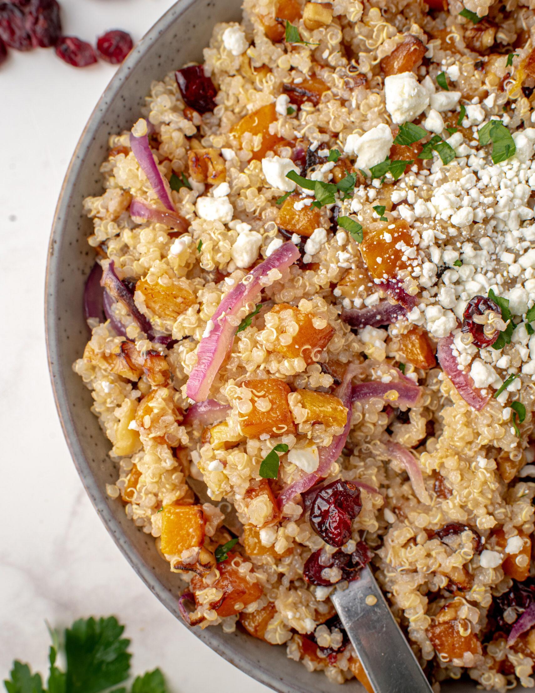 5. Combine the salad. In a large bowl the cooked butternut squash and onions, warm quinoa, walnuts and cranberries. Top with apple cider dressing and stir to combine.