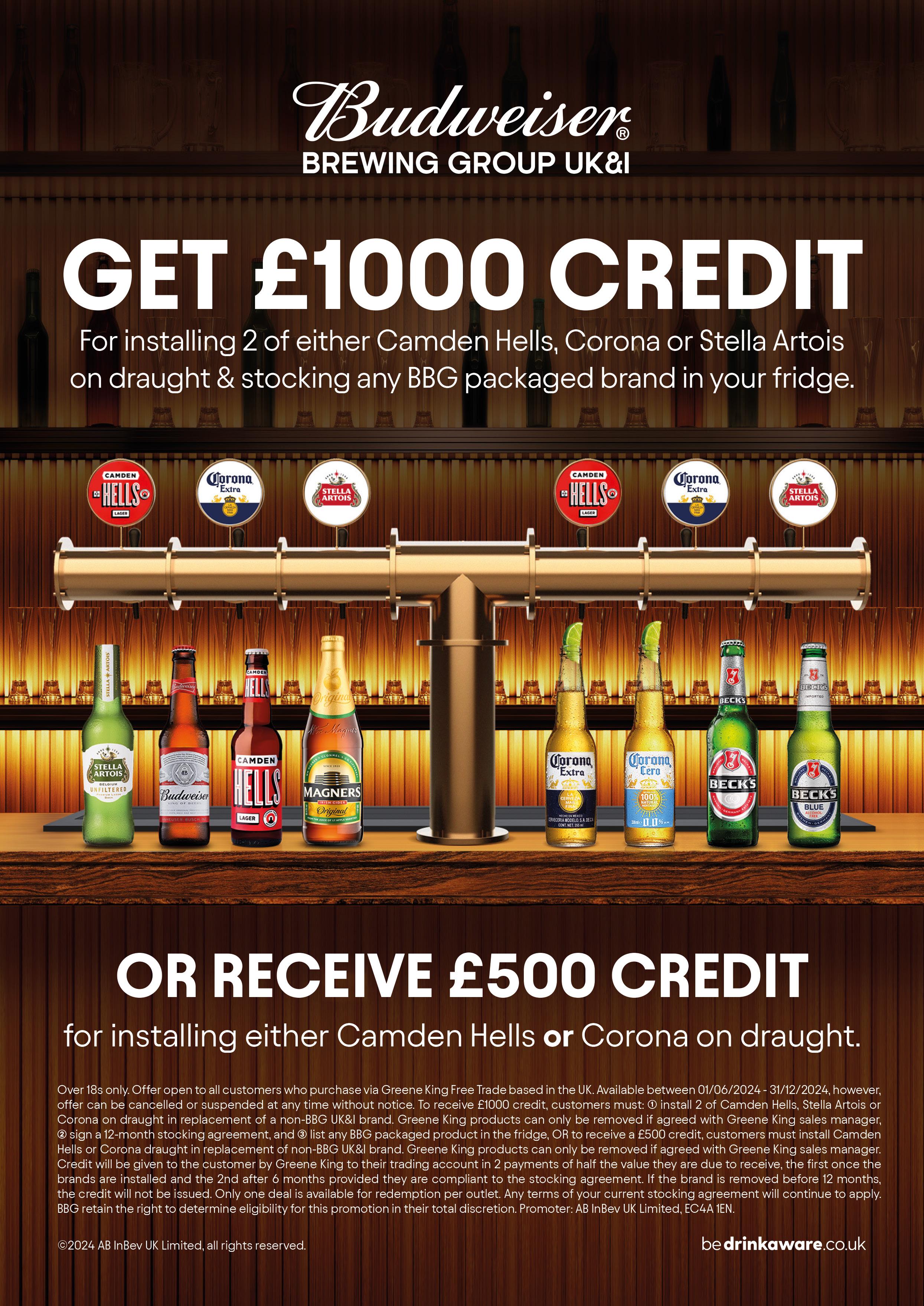 Install 2 of Camden Hells, Corona or Stella Artois on draught and receive £1000 credit; install either Camden Hells or Corona and receive £500 credit. 1 per customer