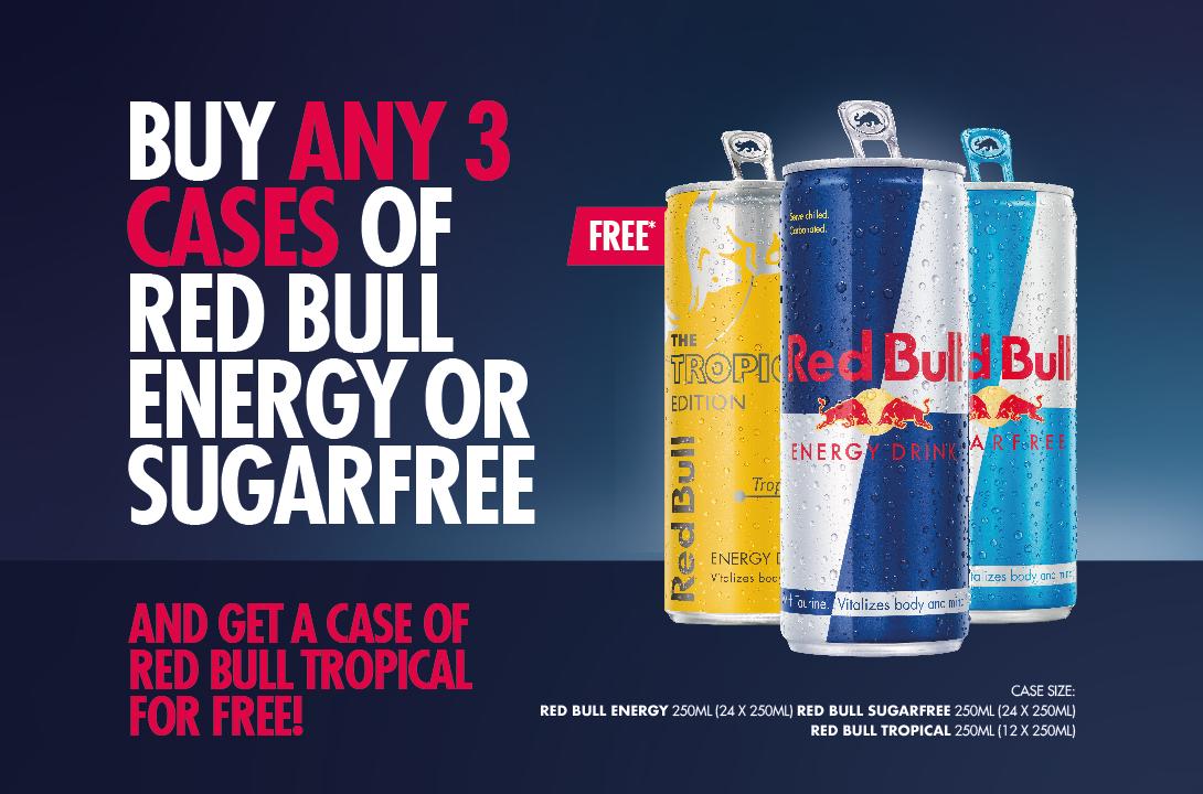 Buy and 3 cases from the Red Bull Energy and Red Bull Sugarfree range and get a case of Red Bull Tropical free.