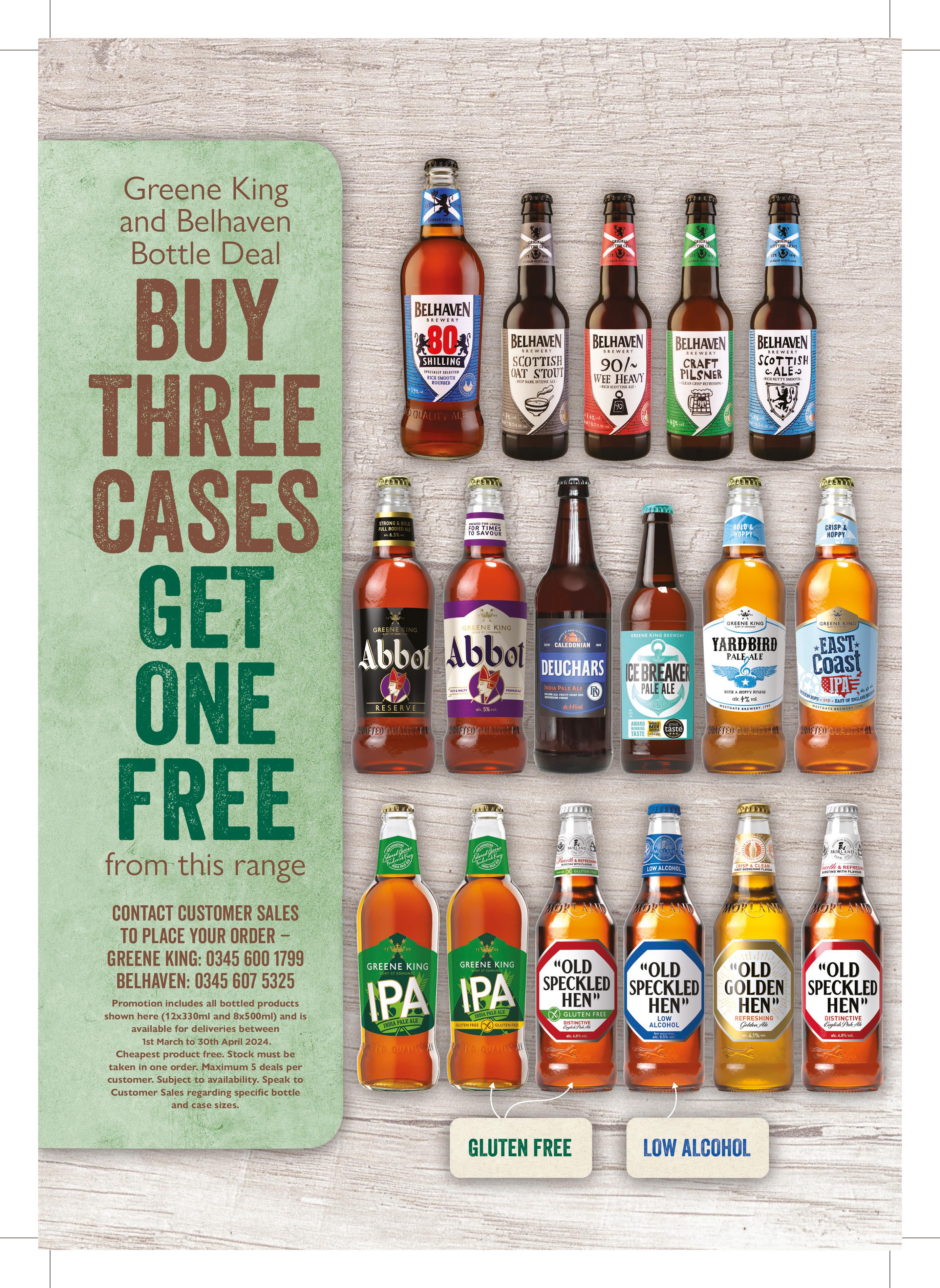 Buy 3 x cases of Greene King and Belhaven bottles and get 1 case free.