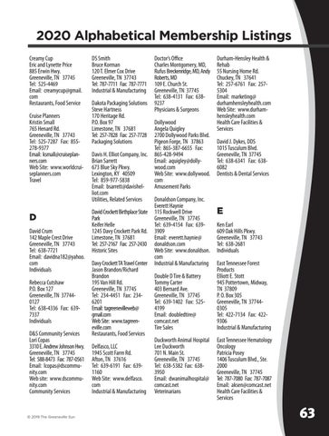 Durham-Hensley Health & Rehab 55 Nursing Home Rd. Chuckey, TN 37641 Tel: 257-6761 Fax: 2575304 Email: marketing@ durhamhensleyhealth.com Web Site: www.durhamhensleyhealth.com Health Care Facilities & Services David J. Dykes, DDS 1015 Tusculum Blvd. Greeneville, TN 37745 Tel: 638-6341 Fax: 6386082 Dentists & Dental Services