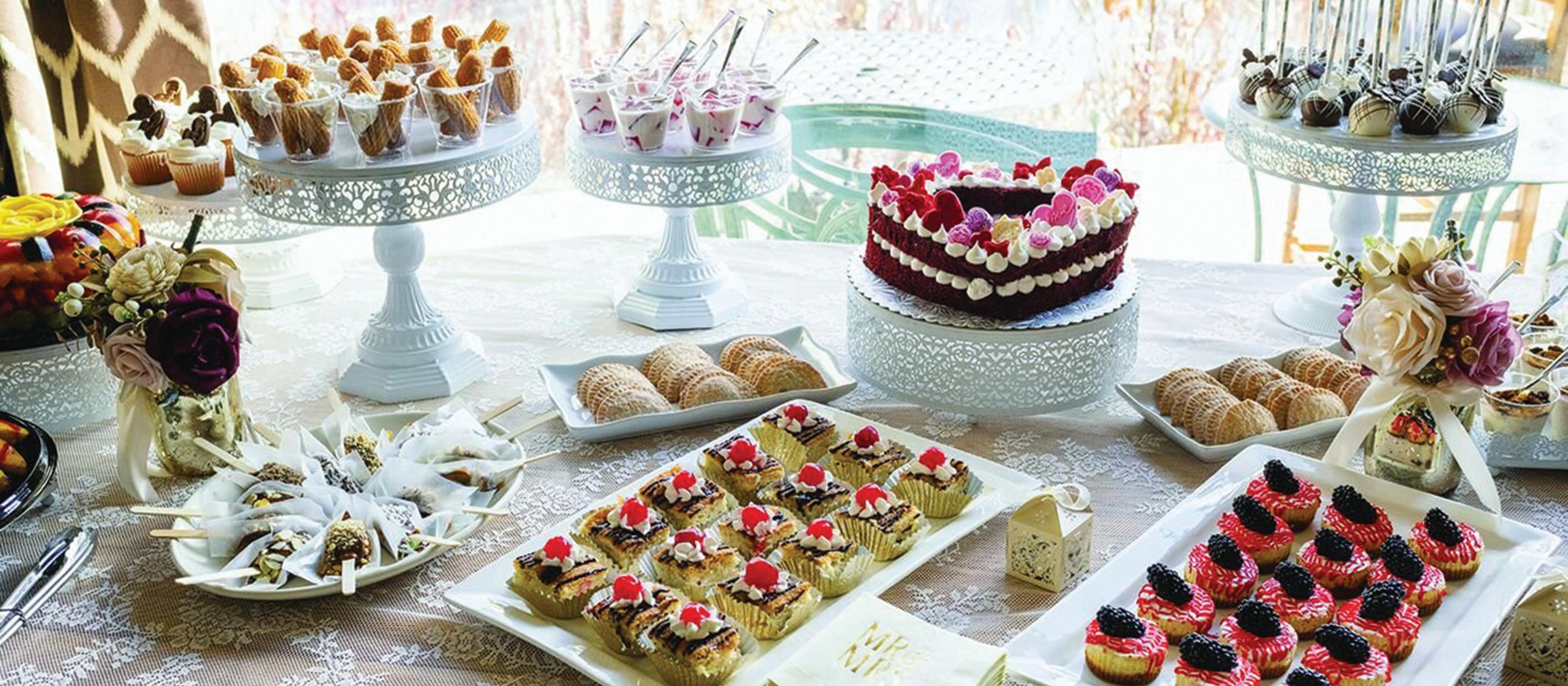 • Interesting sweets display — Couples can elevate their wedding receptions by offering guests something that’s a cut above a piece of wedding cake. A “Viennese Hour,” also known as a “Venetian Hour,” is a popular wedding tradition, particularly in the tri-state area on the east coast of the United States. This hour features a lavish dessert buffet presented after the cake cutting. Couples need not have a traditional Venetian Hour, however. They can offer a table filled with various candies, cordials, doughnuts, cupcakes, or whatever special sweet they want to showcase. Serve with monogrammed napkins.