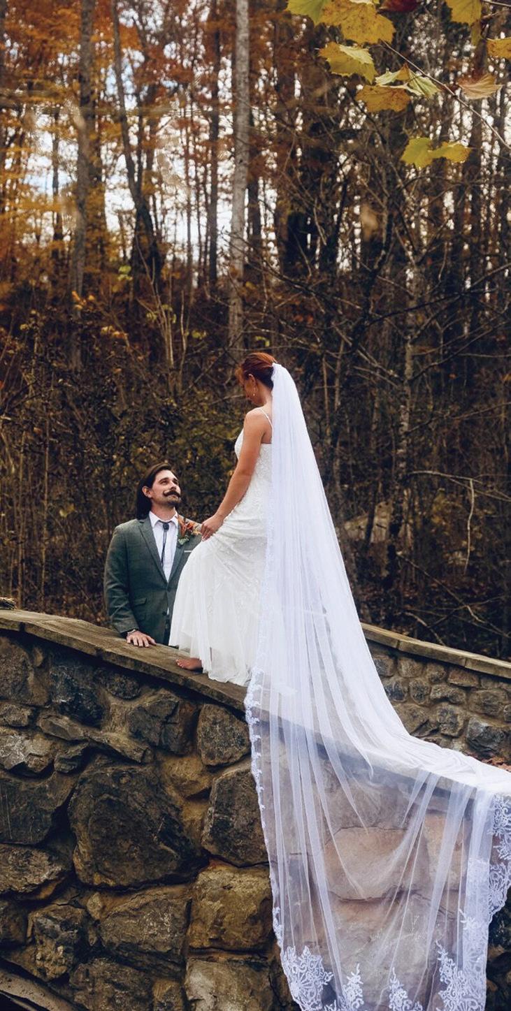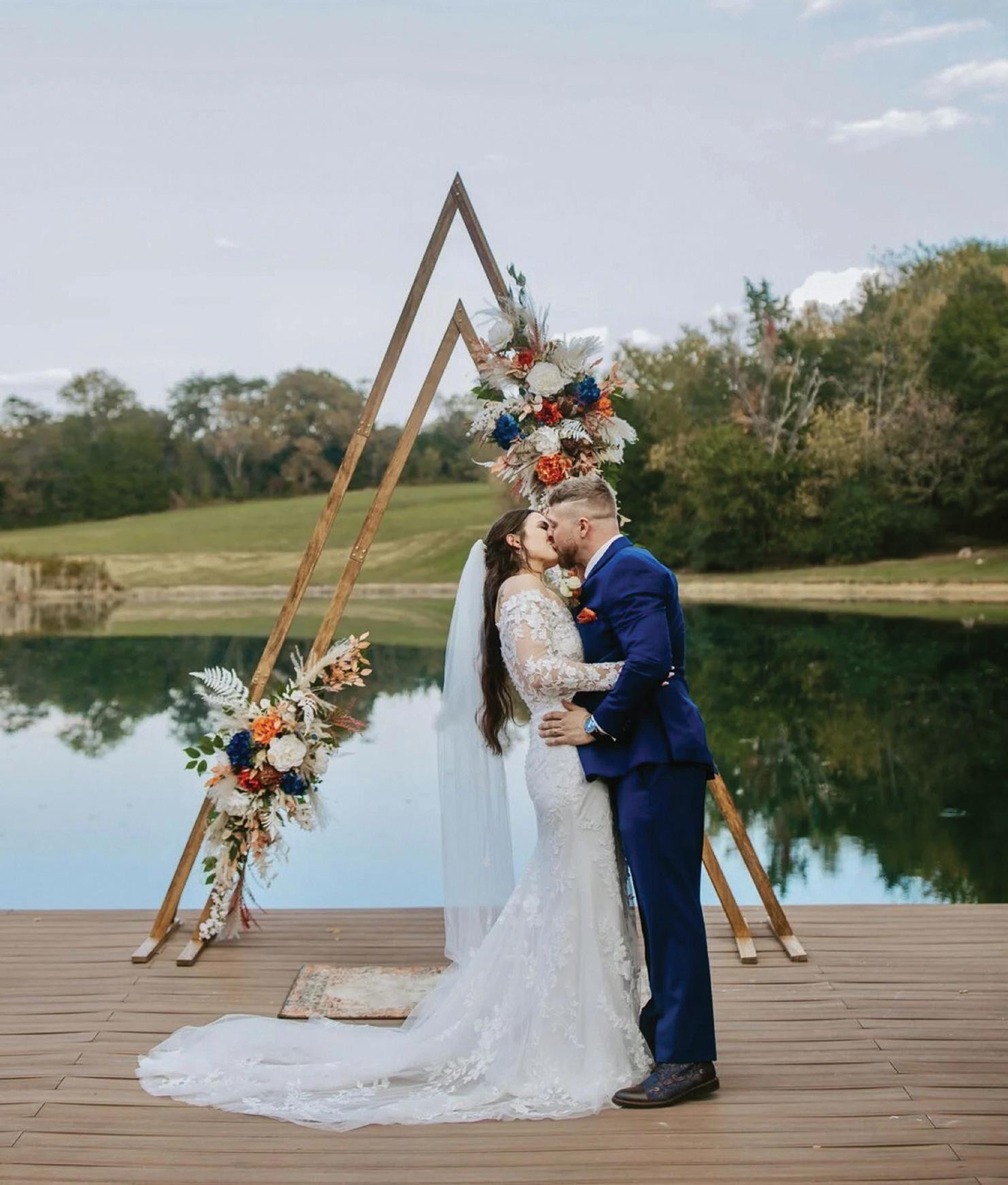 For the second time in a week, MaKayla and Eric changed vows, standing on a hillside at the farm before a cross arbor that Eric had built for the ceremony. This time, the bride was dressed for the occasion in a floor-length, lace-embellished, white gown and a stunning veil that draped elegantly down her back. The groom had traded his police uniform for a handsome hunter green suit, white dress shirt and burnt orange bow tie.