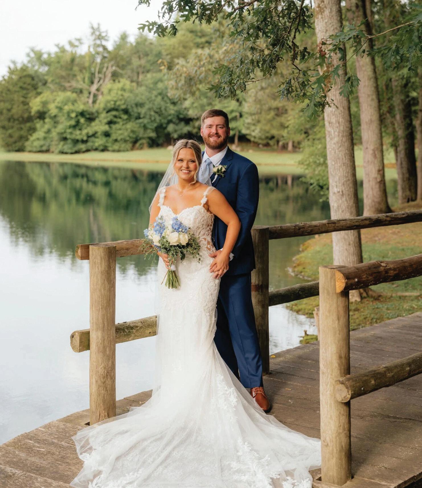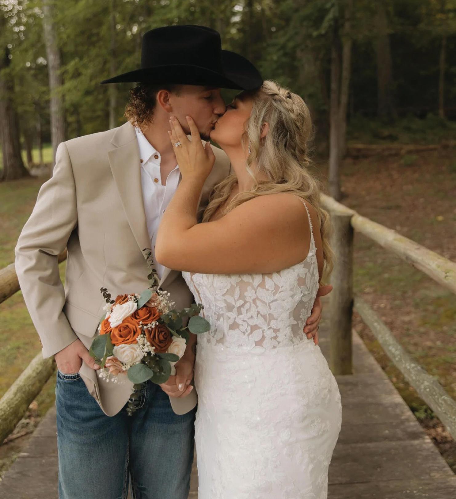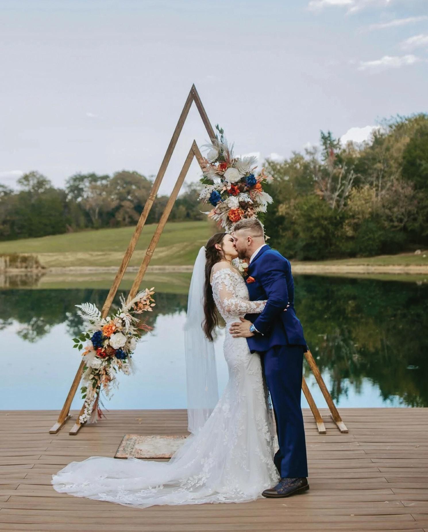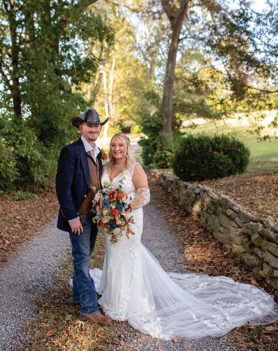 For the second time in a week, MaKayla and Eric changed vows, standing on a hillside at the farm before a cross arbor that Eric had built for the ceremony. This time, the bride was dressed for the occasion in a floor-length, laceembellished, white gown and a stunning veil that draped elegantly down her back. The groom had traded his police uniform for a handsome hunter green suit, white dress shirt and burnt orange bow tie.