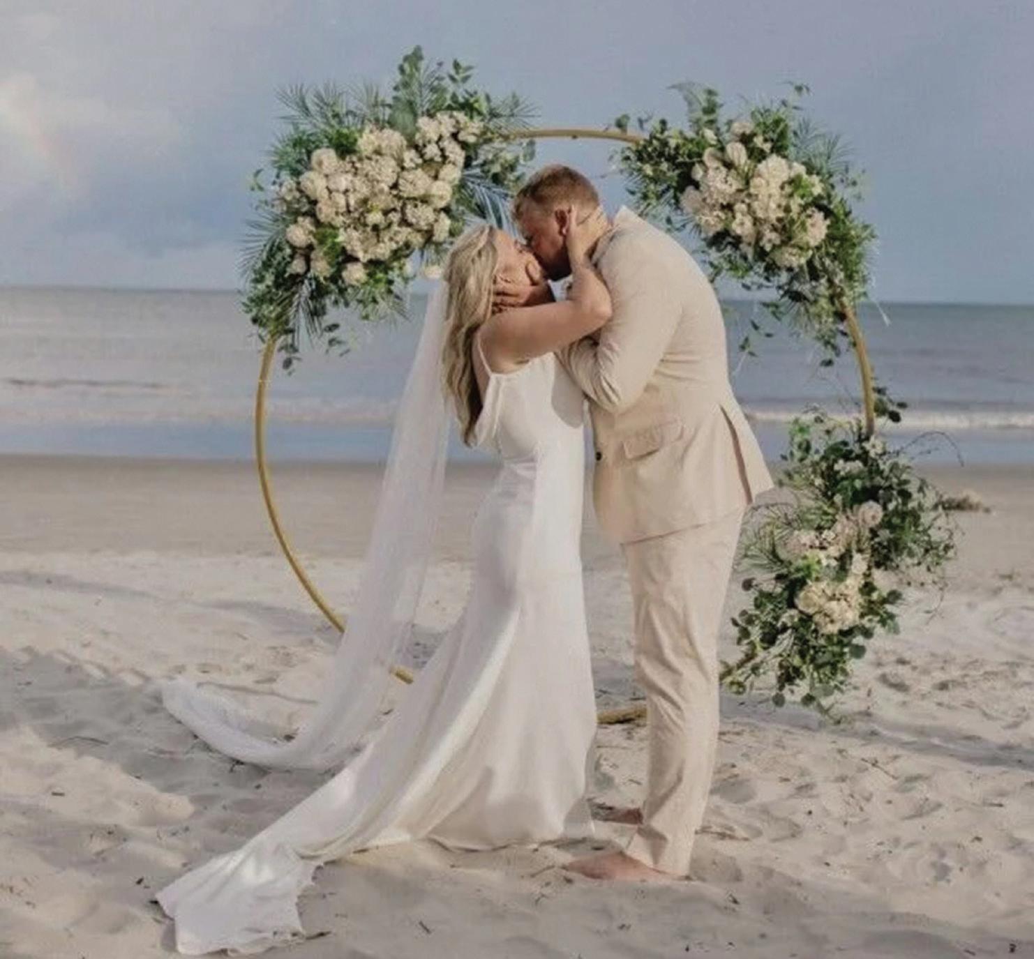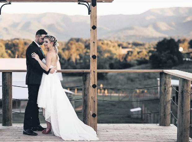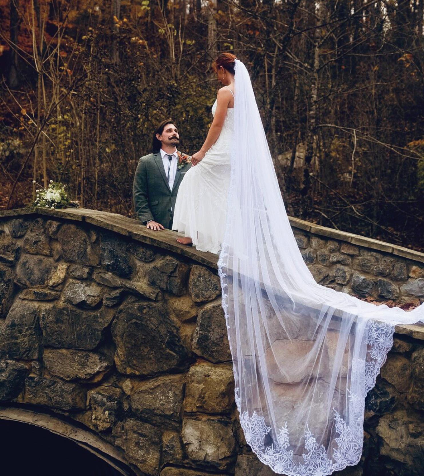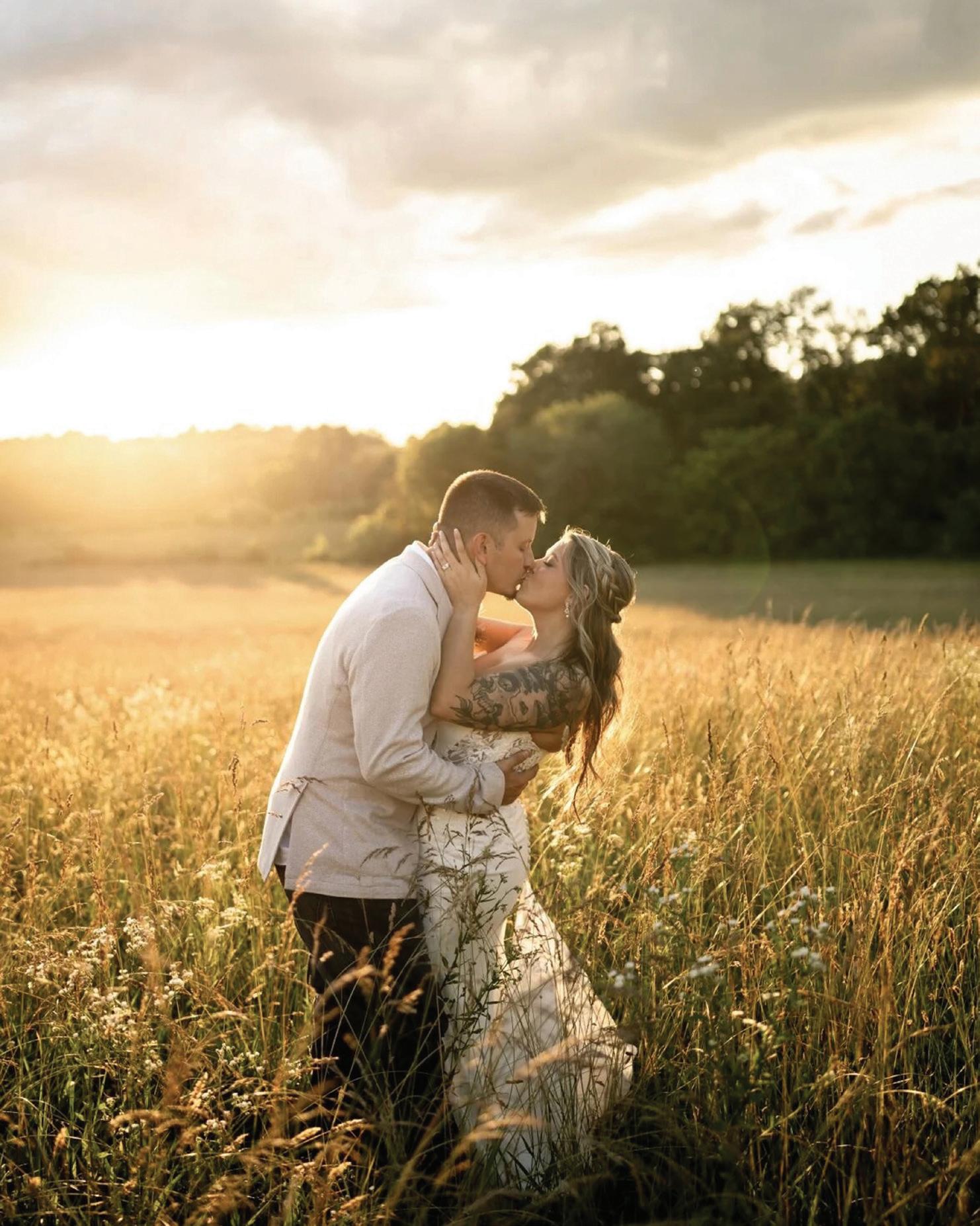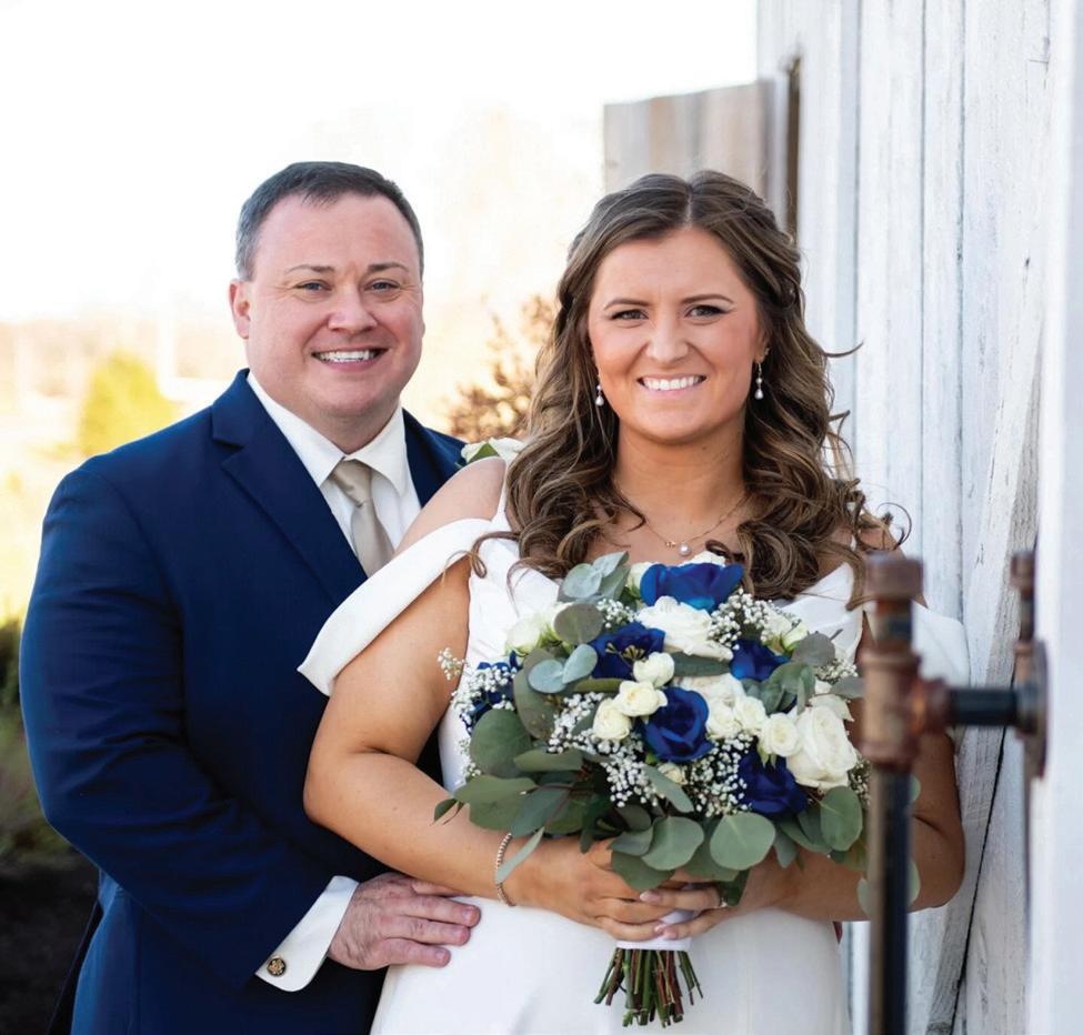 For the second time in a week, MaKayla and Eric changed vows, standing on a hillside at the farm before a cross arbor that Eric had built for the ceremony. This time, the bride was dressed for the occasion in a floor-length, laceembellished, white gown and a stunning veil that draped elegantly down her back. The groom had traded his police uniform for a handsome hunter green suit, white dress shirt and burnt orange bow tie.