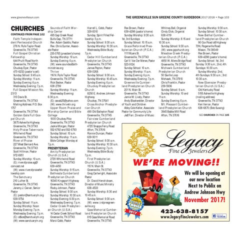Harrell L. Cobb, Pastor 329-8310 Sunday, Spirit Filled Fellowship: 5 p.m. Sunday School: 9:30 a.m. Sunday Worship: 10:30 a.m. Wednesday Bible Study: 7 p.m. Cedar Hill Cumberland Presbyterian Church Greeneville, TN 37743 James Peyton, Pastor 639-0268 Sunday School: 9:30 a.m. Sunday Worship: 10:45 a.m. Sunday Evening: 6 p.m. Chuckey Presbyterian Church 8250 E. Andrew Johnson Highway Chuckey, TN 37641 Cross Anchor Presbyterian Church 490 Old Baileyton Road Greeneville, TN 37745 Fairview Cumberland Presbyterian Church 4720 Snapps Ferry Road Afton, TN 37616 Ronnie Duncan, Pastor 639-9011 Sunday School: 9:30 a.m. Sunday Worship: 10:30 a.m. Sunday Evening: 7 p.m. Wednesday Bible Study: 7 p.m. First Presbyterian Church (U.S.A.) 110 N. Main St. Greeneville, TN 37743 Greg Cartwright, Associate Pastor Dr. David Hendricksen, Director of Music Ministry 638-4533 Sunday Worship: 8:30 and 10:45 a.m. Sunday School: 9:30 a.m. (W): www.firstpresgreeneville.org Gass Memorial Cumberland Presbyterian Church 815 Gass Memorial Road Greeneville, TN 37745