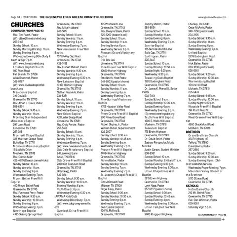 105 Windward Lane Greeneville, TN 37743 Rev. Dwayne Steele, Pastor 525-3260 (deacon’s cell) Sunday School: 10 a.m. Sunday Worship: 11 a.m. Evening Service: 6 p.m. Wednesday Service: 6 p.m. Pleasant Grove Missionary Baptist P.O. Box 246 Limestone, TN 37744 Pine Grove Free Will Baptist 12690 Horton Highway Greeneville, TN 37745 Pete Smith, Host Pastor 348-6803 (pastor’s home) Sunday School: 10 a.m. Sunday Worship: 11 a.m. Sunday Evening: 6 p.m. Wednesday Evening: 7 p.m. Pine Springs Missionary Baptist 4765 Houston Valley Road Greeneville, TN 37743 Piney Grove Free Will Baptist 990 Piney Grove Road Greeneville, TN 37743 Robert Shipley Jr., Pastor William Ricker, Superintendent 422-2807 Sunday School: 9:30 a.m. Sunday Worship: 10:45 a.m. Sunday Evening: 6 p.m. Wednesday Evening: 7 p.m. Pyburn Free Will Baptist 14094 Horton Highway Greeneville, TN 37745 Ronnie Baxter, Pastor Sunday Worship: 10 a.m. Sunday Evening: 7 p.m. Wednesday Evening: 7 p.m. St. Joseph’s Chapel Free Will Baptist 790 McDonald Road Midway, TN 37809 Roger Ealey, Pastor Sunday School: 9:30 a.m. Sunday Worship: 10:30 a.m. Sunday Evening: 6 p.m. Wednesday Evening: 7 p.m. Sunnyside Baptist 100 W. Rollins St. Greeneville, TN 37743