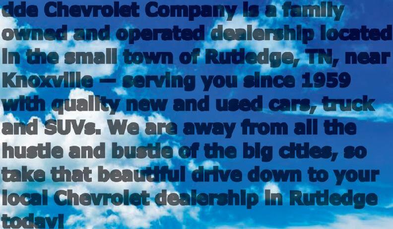 Ed r dde Chevrolet Company is afamily owned and operated dealership located in the small town of Rutledge, TN, near Knoxville —serving you since 1959 with quality new and used cars, truck and SUVs. We are away from all the hustle and bustle of the big cities, so take thatbeautiful drive down to your local Chevrolet dealership in Rutledge today!