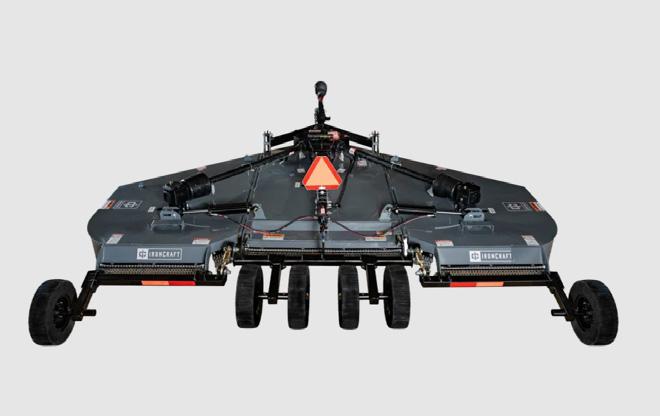 Utilizing a smooth-top deck and spring suspension, the 2515 Series Medium-Duty 15-Foot FlexWing Cutters from IronCraft will make quick work of tough jobs. Designed for use with tractors with a 50 hp minimum, this medium-duty Flex-Wing requires only one hydraulic remote. For its 180-inch cut width, the cutter uses three spindles with two free-swinging blades each, which reduce the shock of impact when a stationary object is contacted. Slip clutches protect the gearboxes and drivelines from damage. Standard equipment includes driveline shields, clutch shields, chain discharge shields and a safety tow chain. Additional specs include: