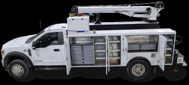 Stellar's TMAX Aluminum Mechanic Truck Series' new 13-foot aluminum body offers compartment storage and is intended for a 108-inch cab-to-axle chassis with 22,000- to 22,900-pound gross vehicle weight rating, such as the Ford F600 or Chevrolet 6500. Similar to other TMAX 1 models, the TMAX 1-13 Aluminum Mechanic Truck is for cranes up to 53,100 foot-pounds, like the Stellar 86 Series Telescopic Service Crane. The TMAX Series features the crane carrying reliability of the Stellar Torq-Isolator torsion box understructure and crane compartment. This feature isolates the crane’s lifting forces into the stabilizers and chassis frame, rather than into the storage compartment, avoiding twists to the truck’s body and doors. TMAX Aluminum Mechanic Truck bodies feature aluminum extrusion compartment tops with two built-in accessory mounting rails. These mounting rails eliminate the need to drill holes in the compartment tops, allowing for mounting and relocating of accessories.