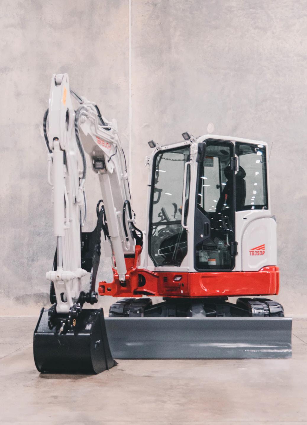 Takeuchi’s TB350Rhas a rear swing overhang of just 2.95 inches, allowing operators to focus more on their work and worry less about rear-swing impacts. For greater comfort, the excavator features a deluxe, high-back, six-way-adjustable suspension seat, adjustable arm rests, low-effort pilot controls, large flat floor area and integrated footrests. The TB350’s canopy configuration includes a 4.3-inch high-definition, multifunction color monitor, while the cab model has an easy-to-view, 7-inch touchscreen, multifunction color monitor with integrated air conditioner and radio functions. An intuitive jog dial on the cab model provides operators with easy navigation and control of the multifunction monitor and other machine functions at their fingertips. Machine maintenance and service work are more likely to be done correctly and at the right intervals when they’re easy to perform. That’s why Takeuchi designed the TB350R with a wide-opening rear engine service door and a rightside cover that opens overhead for quick access to key daily inspection points. Takeuchi’s Fleet Management (TFM) telematics system comes standard on the TB350R. TFM reduces downtime and controls costs by providing owner/operators with machine health and condition, run time (hours) and machine location, as well as remote diagnostics, scheduled maintenance reminders and customizable alert settings.