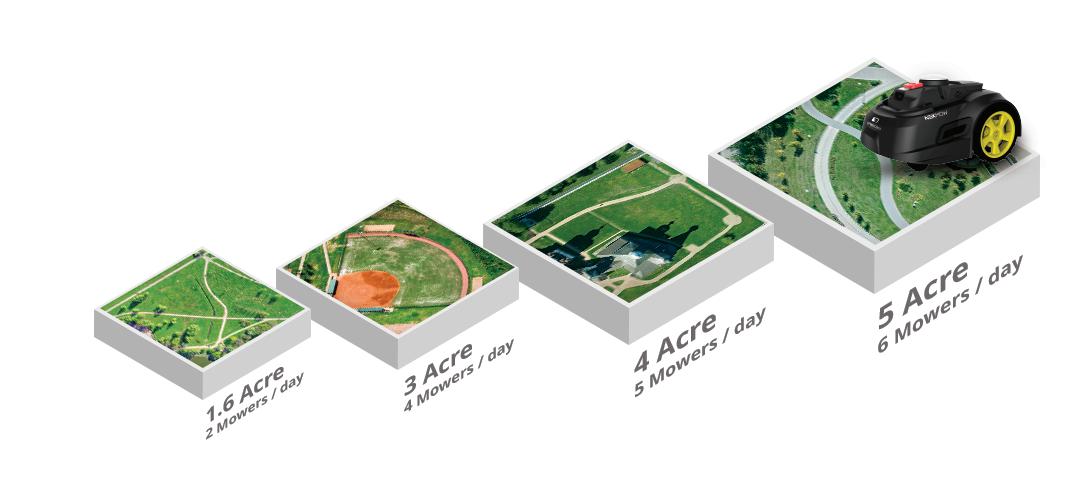 • Mowing capacity: one Nexmow can mow .14 acres per hour; a fleet of four can mow .56 acre per hour