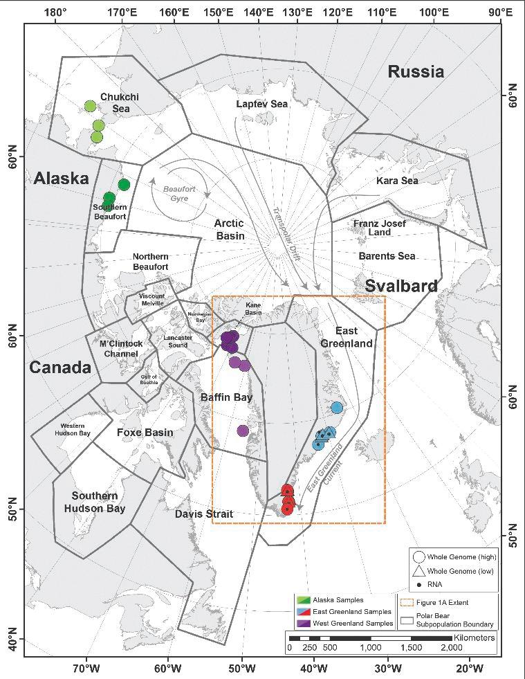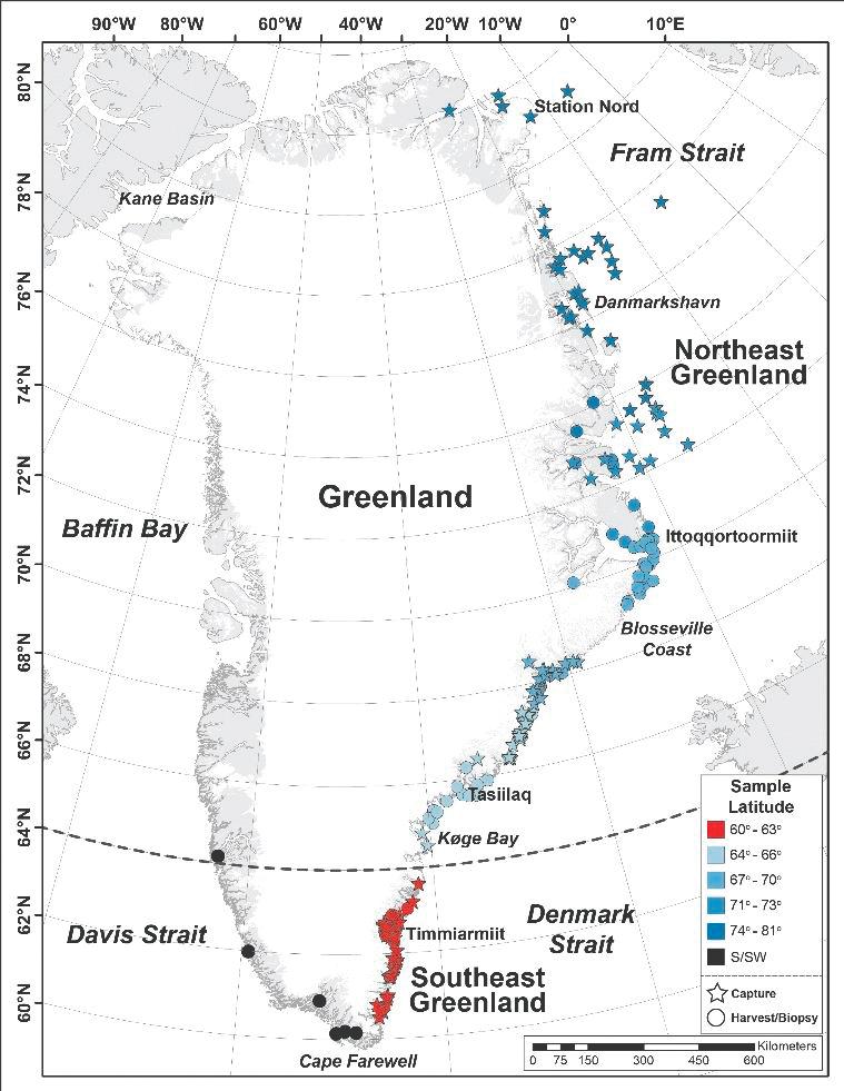 Figur 5. Kortet viser, hvor prøver til hel-genom og RNA analyserne kom fra (2015-2017). Prøver fra hhv. Sydøst -og Nordøstgrønland blev sammenlignet med prøver fra bestandene i hhv. Baffin Bugt, Kane Bassin, sydlige Beaufort Hav, og Tjutkerhavet (Chukchi Sea); (1).