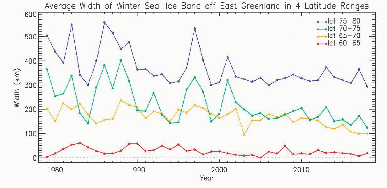 Figur 2. Den gennemsnitlige bredde af drivisbæltet langs den østgrønlandske kyst om vinteren (1979-2018) – vist for fire breddegrad-afsnit. Man vil se, at drivisen alle steder er gået tilbage, hvilket også gælder i Sydøstgrønland (nederste røde linje); (1).