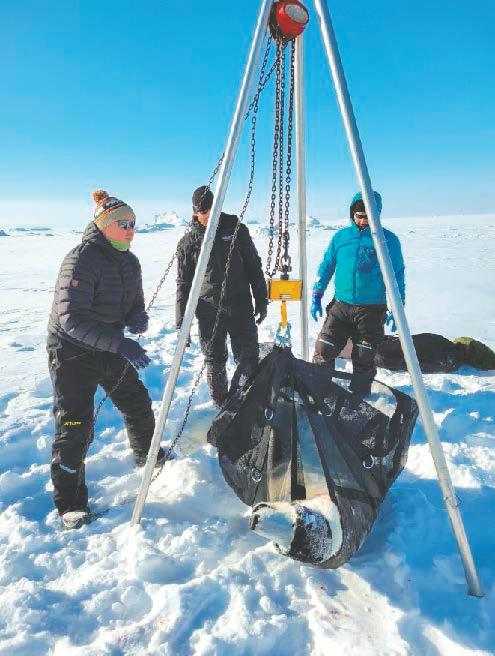 Foto 5. De bedøvede bjørne blev vejet, så man bl.a. kunne sammenligne kropsvægt- og mål med lignende data fra andre bestande (foto: K.L. Laidre).