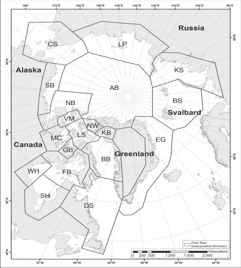 Figur 1. Kort med grænserne for de indtil dette studium kendte isbjørnebestande, som de er blevet vurderet af IUCN's International Polar Bear Specialist Group. Man vil se, at EG = Østgrønland af IUCN endnu opfattes som én bestand, der også er udbredt i Sydvestgrønland. AB = Arctic Basin/det Arktiske Hav, BB = Baffin Bugt, DS = Davis Strædet, BS = Barentshavet, og NW = Norwegian Bay nævnes i teksten (1).