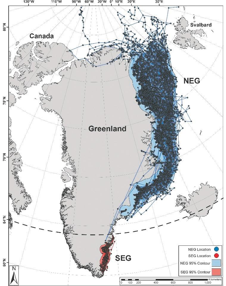 Figur 4. Områder som udnyttes af isbjørne i hhv. Sydøstgrønland (SEG, rød) og Nordøstgrønland (NEG, blå) baseret på positioner modtaget fra satellitsendere, der sad på voksne hunner (1993-2021). De to grupper var adskilt af en ca. 150 km lang strækning, der på nær en enkel, var uden positioner (1).