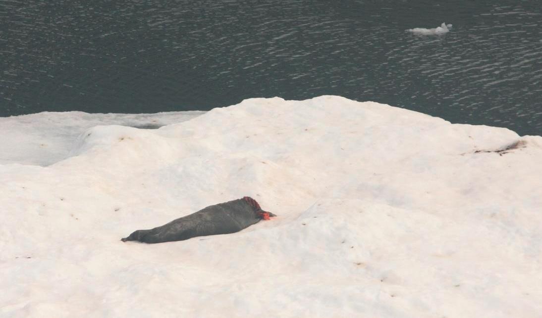 Foto 7. Isbjørne i Sydøstgrønland jager også remmesæler. På denne kraftige flage af drivis lå en voksen remmesæl, der måtte lade livet til en sulten isbjørn (foto: K.L. Laidre).
