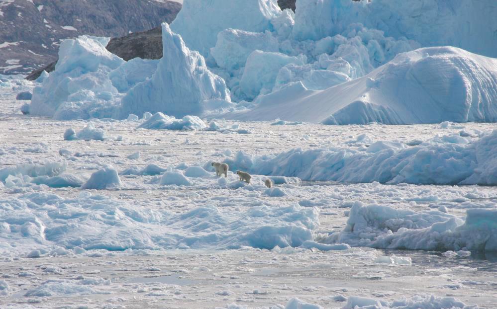 Foto 6 (øverst). En hunbjørn vandrer med sine unger over en blanding af isfjelde og anden gletsjeris i Sydøstgrønland. I mangel af fast havis at jage sæler på det meste af vinter og forår, jager bjørnene i stedet fra is fra gletsjere (foto: K.L. Laidre).