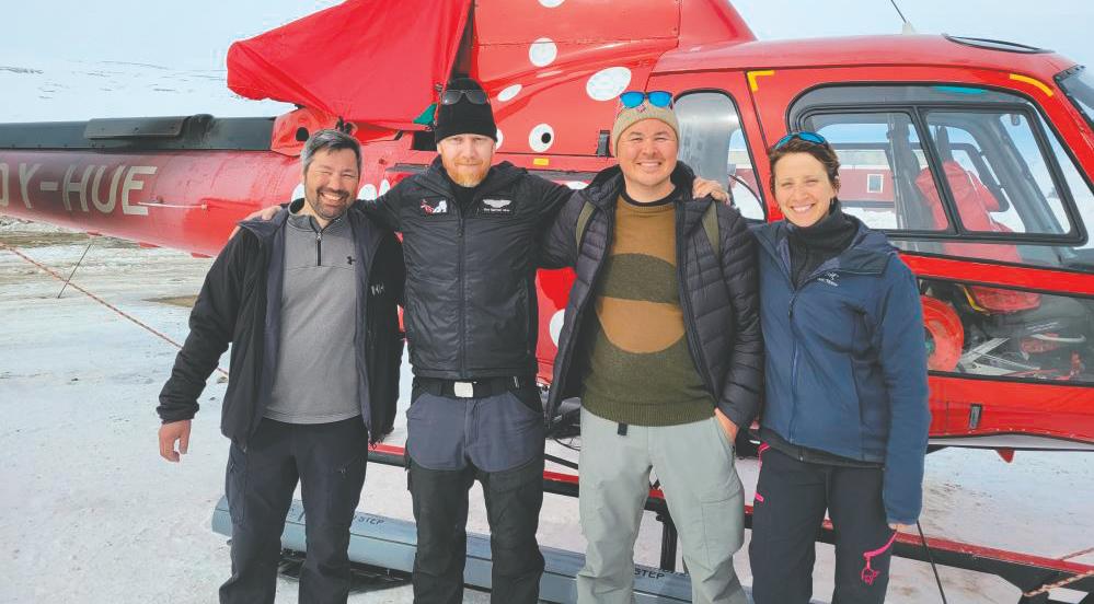 Foto 4. Kerne-teamet i felten (2014-2022) bestod (fra v. til h.) af programkoordinator Carl Isaksen (Pinngortitaleriffik), pilot Geir Akse (AirGreenland), programkoordinator Peter Hegelund (Pinngortitaleriffik), og seniorforsker Kristin Laidre (Pinngortitaleriffik). I nogle af sæsonerne deltog andre i feltarbejdet – der iblandt Fernando Ugarte (foto: K.L. Laidre).