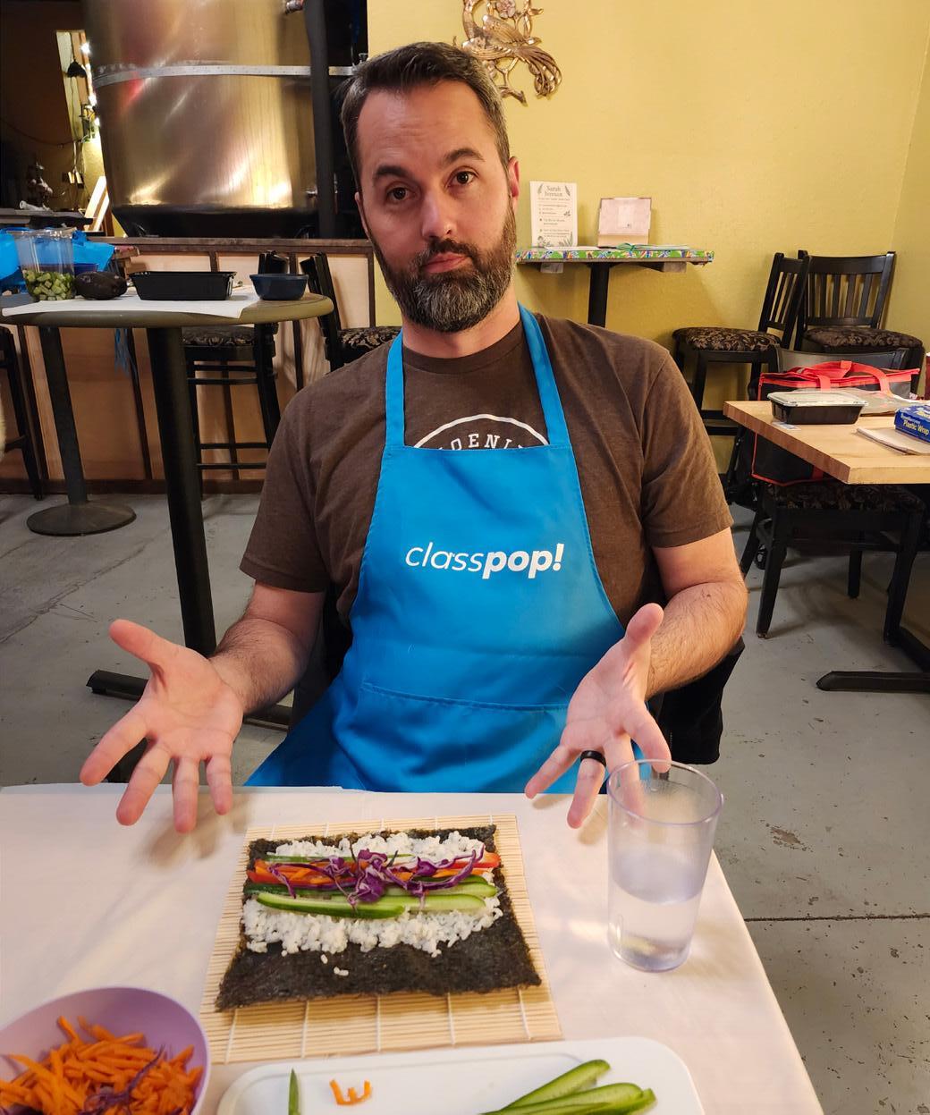 HeHe Said: When we signed up for a sushi-making class, I pictured myself mastering graceful knife work and creating sleek rolls worthy of a Japanese restaurant. Instead, I discovered that sushi-making is much more challenging than it looks, and I have a new appreciation for a beautiful roll of seaweed, rice, and fish. We started by unwrapping our bamboo rolling mat... wait, strike that. This class was held at a brewery, so we started by getting a beer, then we unwrapped our bamboo rolling mats. Sarah, our instructor, was knowledgeable and friendly, and she navigated my sarcastic comments and stupid questions well. She even knew my favorite sushi related factoid: Most of the time when we get wasabi in the U.S., we are not eating real wasabi — just green-tinted horseradish. Our first task was a simple veggie roll. Apply rice to nori paper, add thinly sliced veggies, and roll. Easy, right? Well, not for me. Halfway through I looked like the class paste-eater. My work area was a disaster, I had rice stuck to every surface of my hands, and a lopsided sushi roll that looks like what a real chef would feed to his dog. Roll two was supposed to be an inside-out California roll with the rice on the outside, crab and veggies on the inside, but at this point the selfdoubt started creeping in. Surprisingly, I managed to knock out a beautiful sushi roll and totally redeem myself. Lastly, we learned how to make a quick and easy spicy tuna hand roll that was absolutely delicious. I enjoyed learning a new skill, but the best part was eating the evidence of my poor sushi-making ability. We had a fun time, some laughs, and strengthened our skills enough to attempt having a sushi night at the house... maybe.