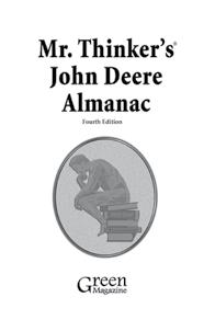 Mr. Thinker’s John Deere Almanac, Fourth Edition All the same info found in earlier editions plus now Dan Brotzman’s New Gen and Gen II SN guide. For all models built from 1918 to 1972: history, SN/year breaks, accurate production numbers (no 820 three cylinder, 1020, 1520, 2020), notes on some significant changes, charts on tractor fluid capacities, cubic inches, compression ratios, torque specs, list of plow beam numbers. Info on proper colors of mufflers, axles, horse drawn equipment, fuels/lubricants, E/W stationary engines, L&G tractors. Chart on heights, weights and top speeds; SN/year charts for models 45 through 105 combines; tractor/loader application chart; SN/year charts for all tractors built from 1973 to 1990; and production numbers for models 4030 and 4230. 8-1/2”x51/2,” soft cover, black/white. MRT4 - $17.95 US, $28.00 C, $36.00 F US = United States • C = Canada price • F = Foreign price