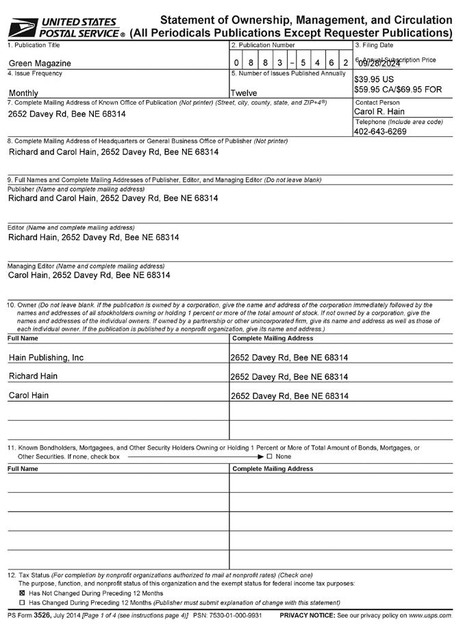 “GREEN MAGAZINE®” (ISSN 0883-5462) is published monthly and released 12 times a year on or about the first of each month for $39.95 per year (Canada: $59.95 per year; Foreign: $69.95 per year) by Hain Publishing, Inc., 2652 Davey Road, Bee, NE 68314-9132. Periodicals postage paid at Bee, NE and additional mailing offices.