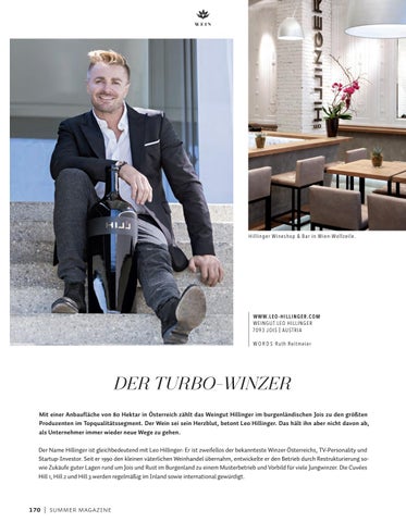 Der Turbo-Winzer Mit einer Anbaufläche von 80 Hektar in Österreich zählt das Weingut Hillinger im burgenländischen Jois zu den größten Produzenten im Topqualitätssegment. Der Wein sei sein Herzblut, betont Leo Hillinger. Das hält ihn aber nicht davon ab, als Unternehmer immer wieder neue Wege zu gehen. Der Name Hillinger ist gleichbedeutend mit Leo Hillinger: Er ist zweifellos der bekannteste Winzer Österreichs, TV-Personality und Startup-Investor. Seit er 1990 den kleinen väterlichen Weinhandel übernahm, entwickelte er den Betrieb durch Restrukturierung sowie Zukäufe guter Lagen rund um Jois und Rust im Burgenland zu einem Musterbetrieb und Vorbild für viele Jungwinzer. Die Cuvées Hill 1, Hill 2 und Hill 3 werden regelmäßig im Inland sowie international gewürdigt.