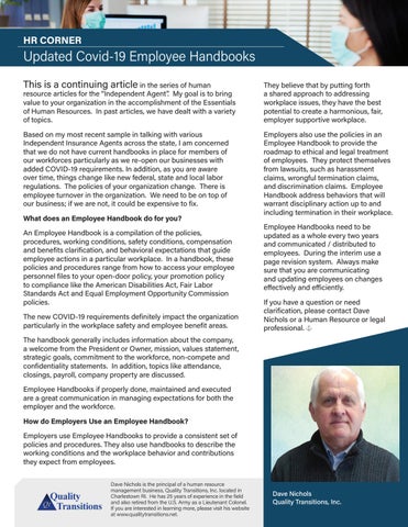 The handbook generally includes information about the company, a welcome from the President or Owner, mission, values statement, strategic goals, commitment to the workforce, non-compete and confidentiality statements. In addition, topics like attendance, closings, payroll, company property are discussed. Employee Handbooks if properly done, maintained and executed are a great communication in managing expectations for both the employer and the workforce. How do Employers Use an Employee Handbook? Employers use Employee Handbooks to provide a consistent set of policies and procedures. They also use handbooks to describe the working conditions and the workplace behavior and contributions they expect from employees. Dave Nichols is the principal of a human resource management business, Quality Transitions, Inc. located in Charlestown RI. He has 25 years of experience in the field and also retired from the U.S. Army as a Lieutenant Colonel. If you are interested in learning more, please visit his website at www.qualitytransitions.net.